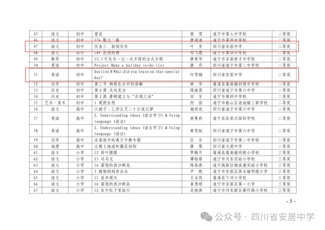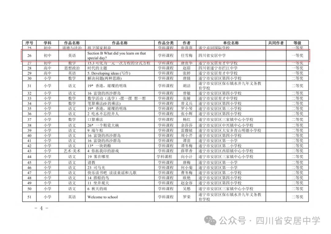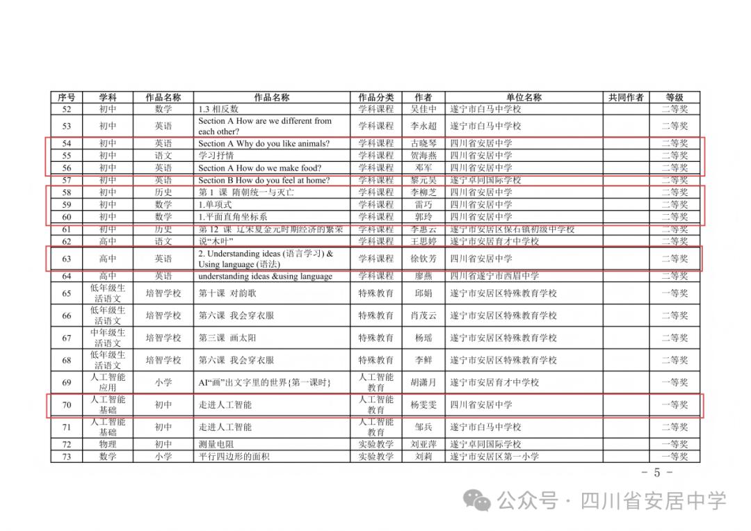 在安居区遴选活动中,蔡红梅的《Unit 2 Home Sweet Home(第四课时》、许凤英的《12 短文二篇》、叶芳的《任务三 新闻写作》、任雪梅的《Section B What did you learn on that special day?》荣获区级“学科课程精品课”一等奖;杨雯雯的《走进人工智能》荣获区级“人工智能教育精品课”一等奖;古晓琴的《Section A Why do you like animals?》、贺海燕的《学习抒情》、邓军的《Section A How do we make food?》、李柳芝的《第 1 课 隋朝统一与灭亡》、雷巧的《1.单项式》、郭玲的《1.平面直角坐标系》、徐钦芳的《2. Understanding ideas (语言学习) &Using language (语法)》荣获区级“学科课程精品课”二等奖。