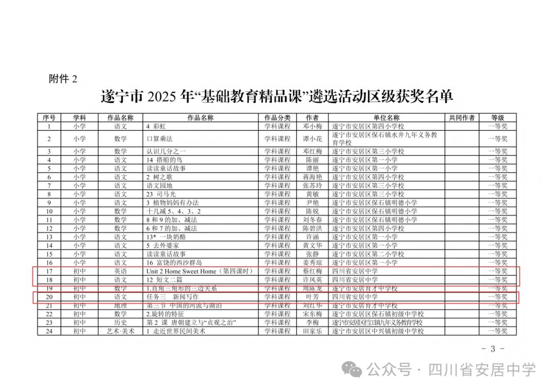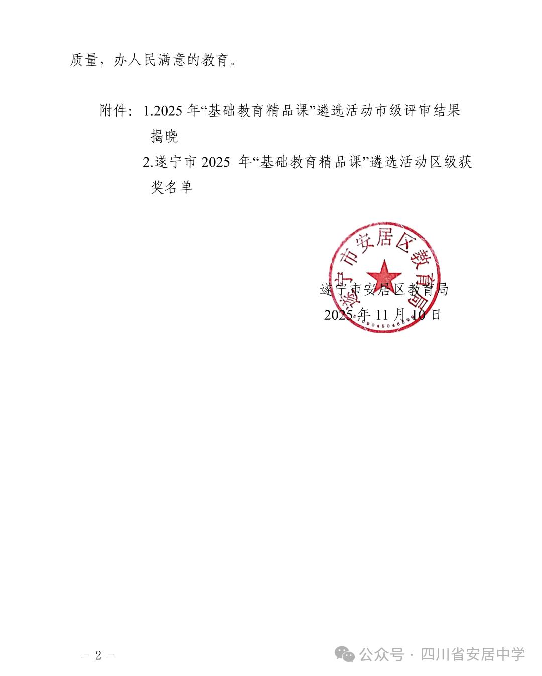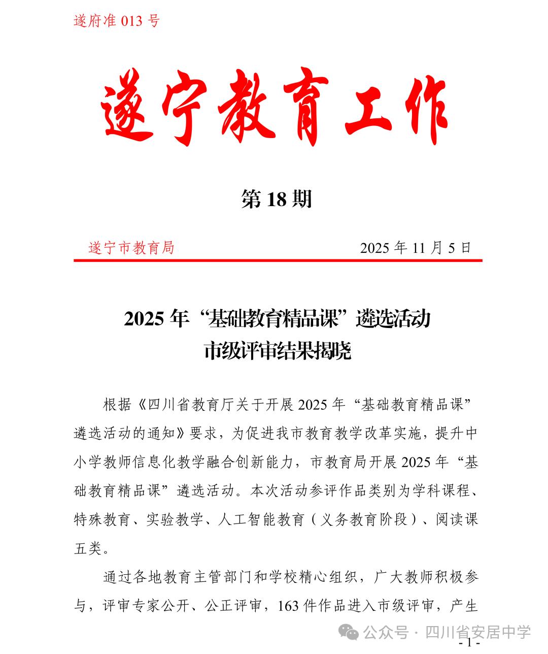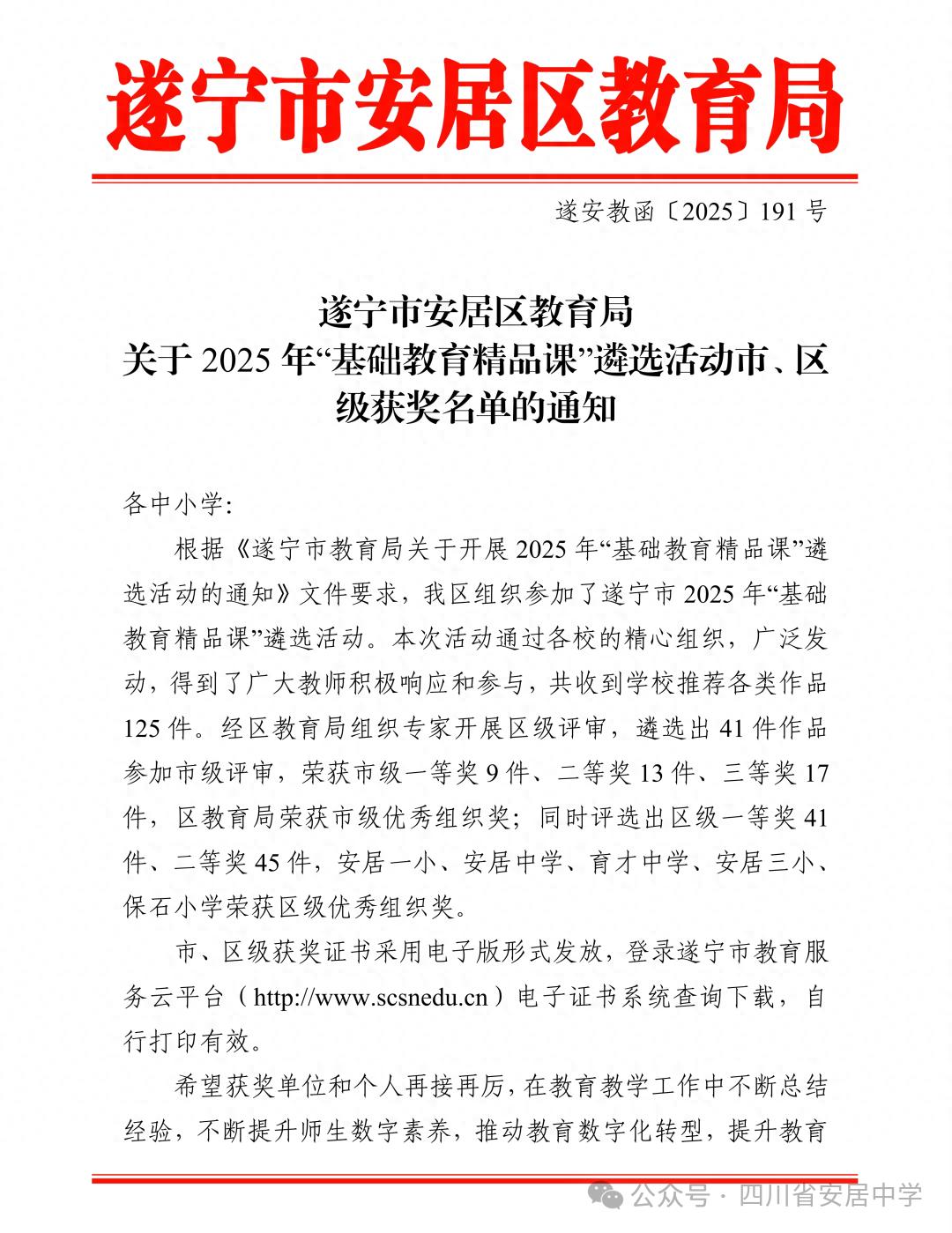 根据《遂宁市教育局关于开展 2025 年“基础教育精品课”遴选活动的通知》文件要求,安居中学组织参加了安居区和遂宁市 2025 年“基础教育精品课”遴选活动。