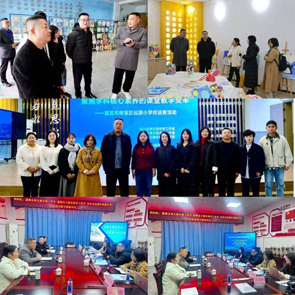 11月17日,在南溪区仙源小学校校长杨召云的陪同下,谭文丽名师工作室与王捷名校长工作室成员参观了校园,深入感受学校办学特色与文化底蕴。随后,双方围绕学校发展规划、课程体系构建及教师专业成长等议题展开深度研讨,为后续送教活动奠定了坚实基础。