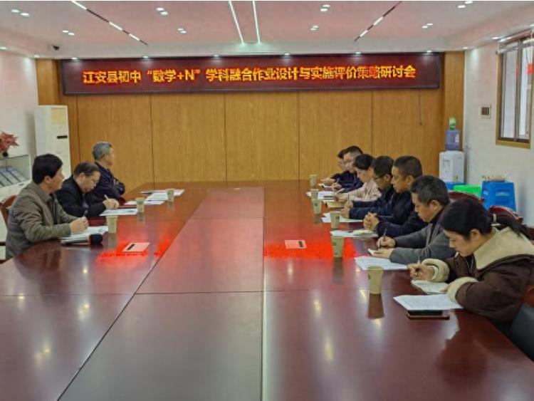 为深入推进省级课题《“三新”背景下县域初中“数学+N”学科融合作业设计策略研究》与市级课题《基于项目化学习的初中数学实践性作业设计策略研究》的实践探索,进一步明晰研究方向、优化研究路径、压实研究责任,2025年11月18日,江安县初中“数学+N”学科融合作业设计与实施评价策略研讨会在汉安中学顺利召开。会议由江安县师培中心副主任、省级课题主研陈林主持,县师培中心教科室主任陈长洪、罗益成到场指导,两个课题的全体主研人员共同参与。