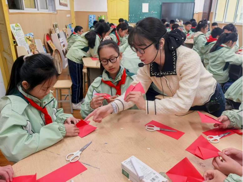 活动现场,张老师先通过展示传统剪纸作品,讲解四川剪纸的“折叠剪刻”技法,再示范五角星剪纸的步骤。学生们根据张老师的示范,专注实践,有的仔细对齐纸边折叠,有的互相比对纸折的层数,有的轻握剪刀把控力度。张老师则俯身协助纠正细节,确保五角星的形态规整。