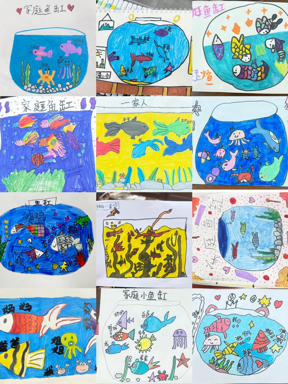 最后登场的是有趣的“家庭鱼缸”绘画活动!孩子们以鱼缸为家庭缩影,用画笔将家人们巧妙地投射为不同生物——妈妈是漂亮的热带鱼,爸爸是稳重的大海龟,自己就是那条最活泼的小鱼。画里还有一家人一起吃饭、讲故事、做游戏的温暖场景。这种独特的创作方式,让孩子们在不知不觉中将内心对家人的情感认知具象化,每一笔色彩都是爱的投射,每一处构图都是温暖的表达。