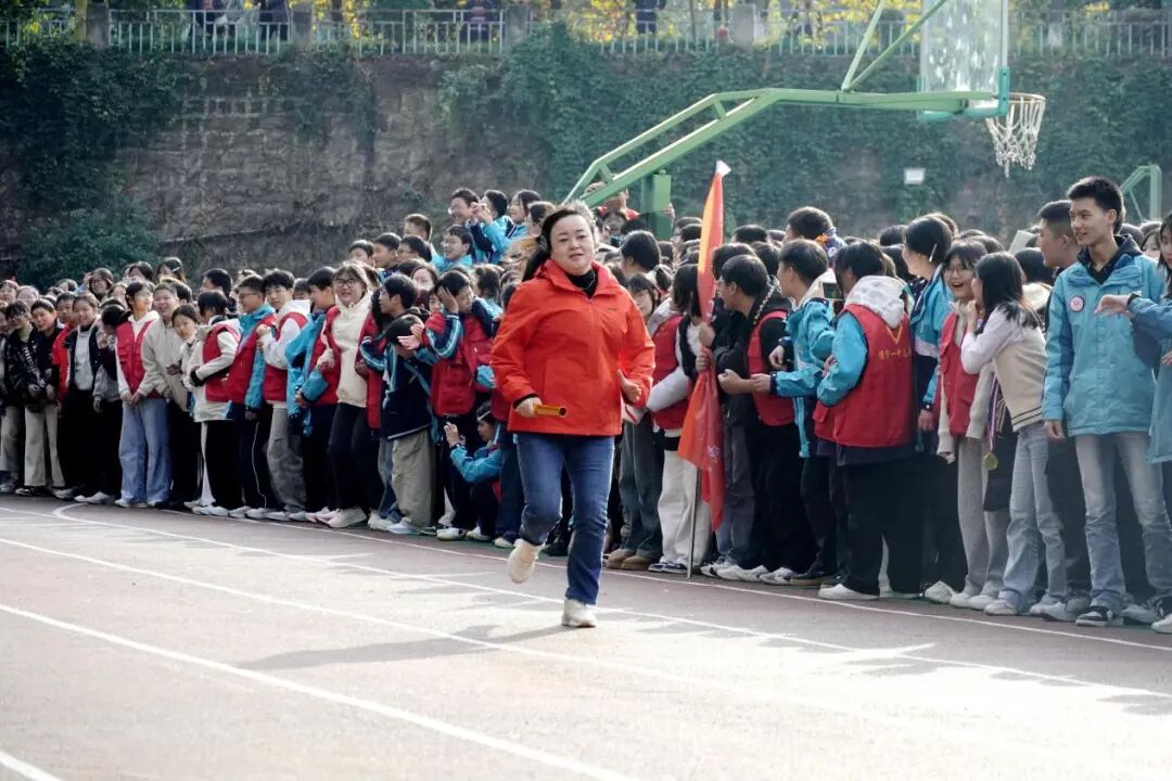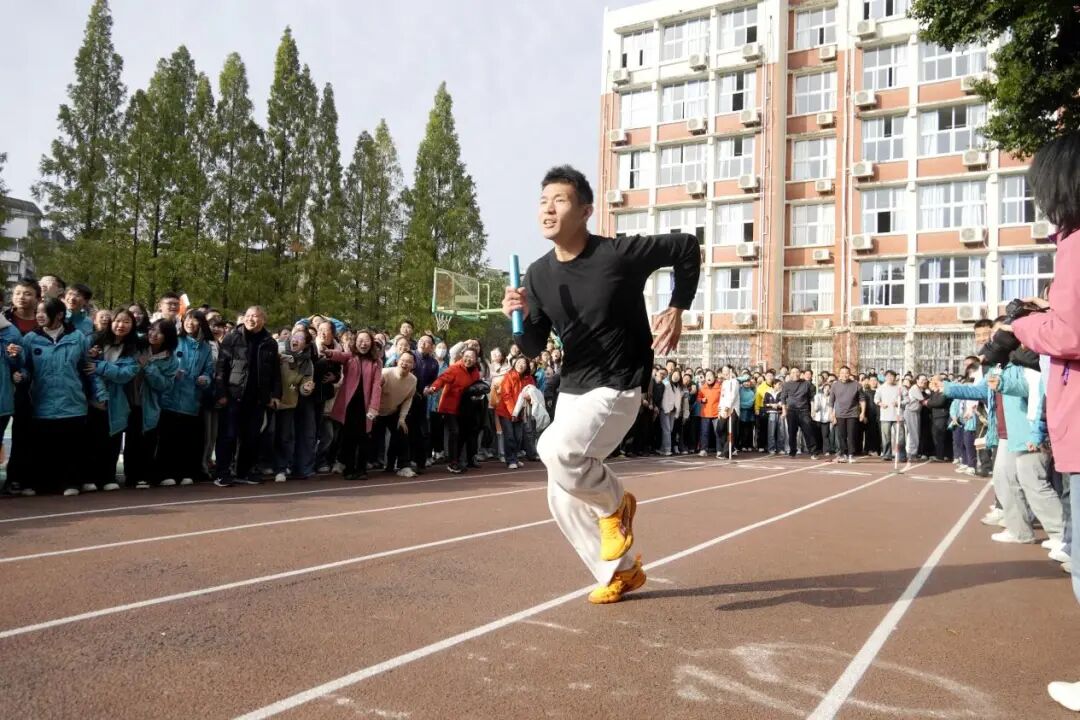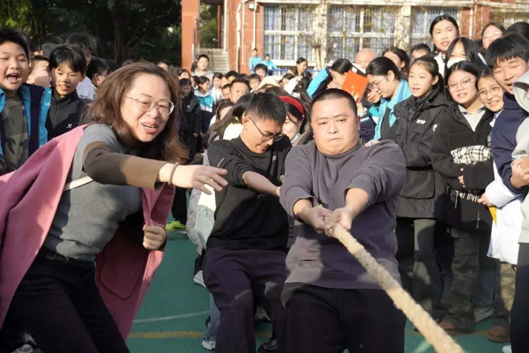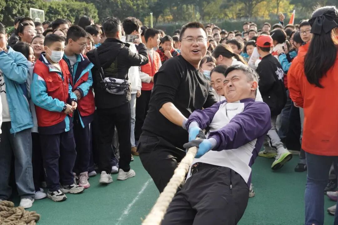 教职工项目同样精彩纷呈。拔河比赛中,各组教职工齐心协力,紧握长绳,展现出坚韧与团结;迎面接力赛中,老师们默契配合,奔跑、递棒、冲刺一气呵成,尽显昂扬风貌与团队精神。