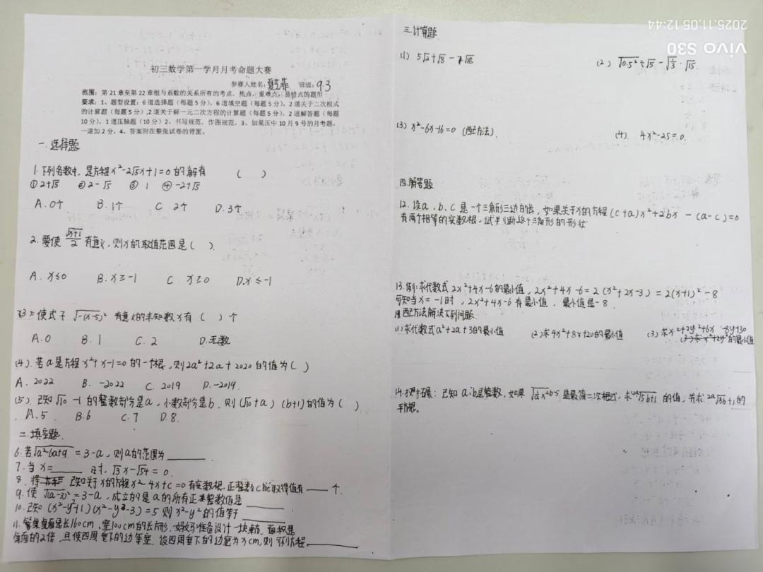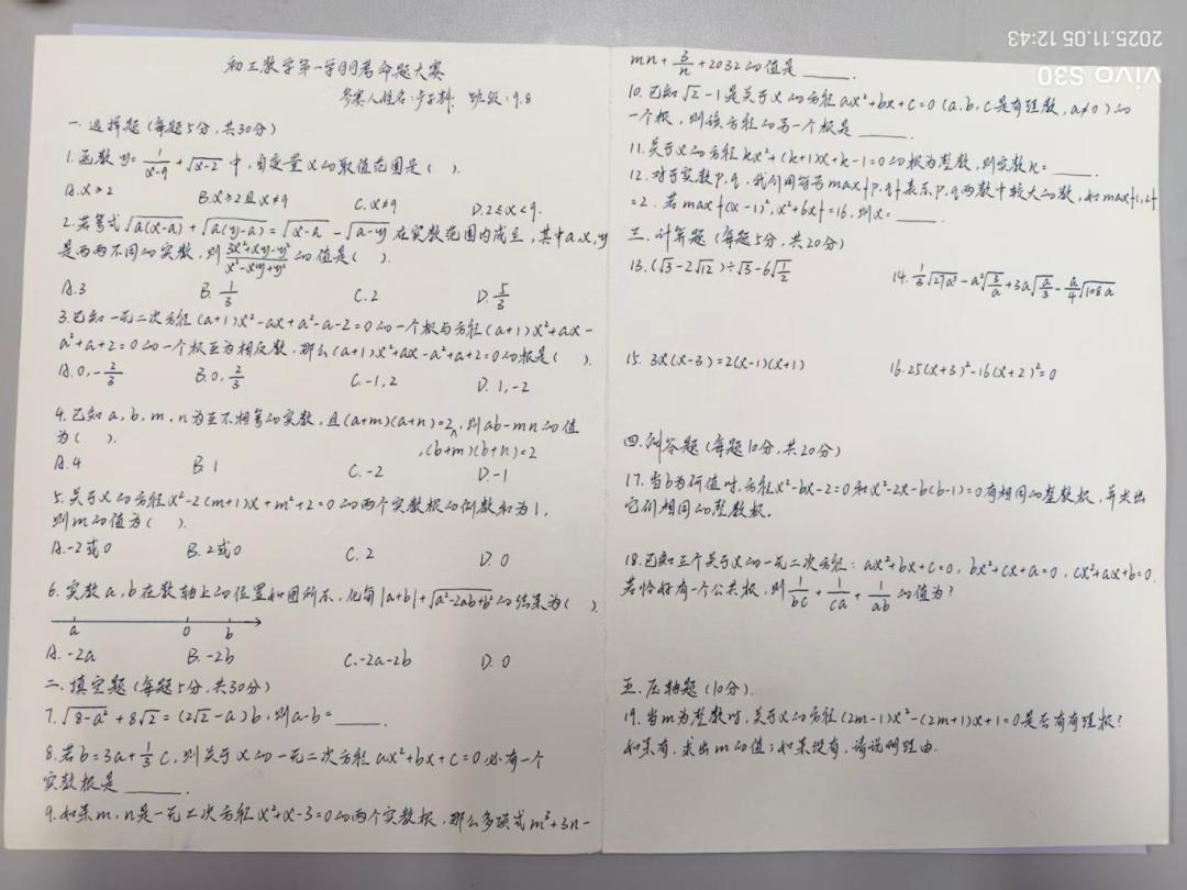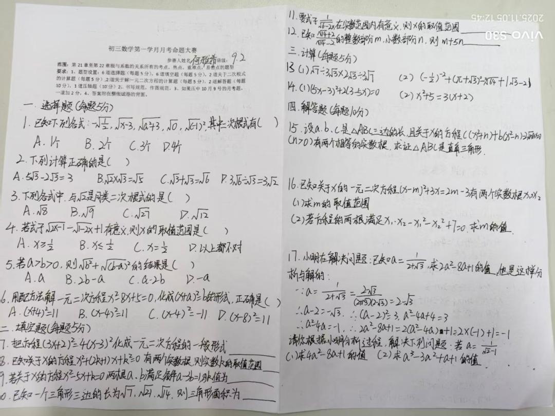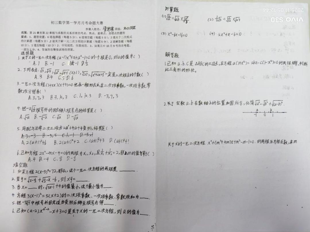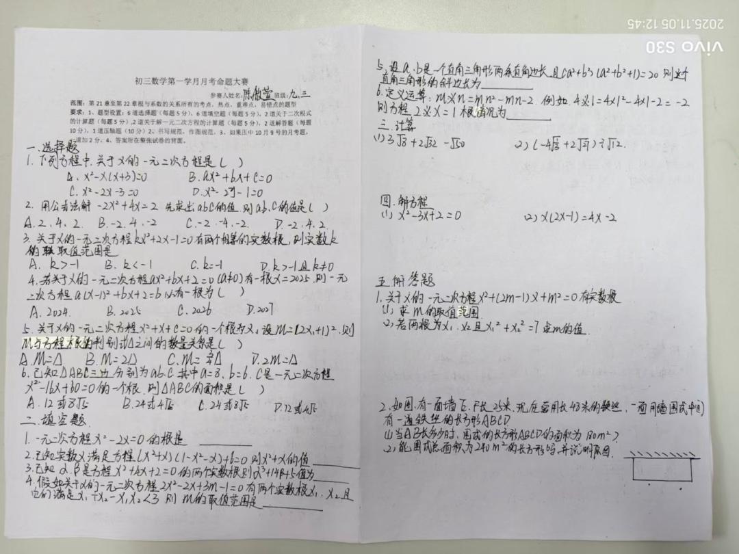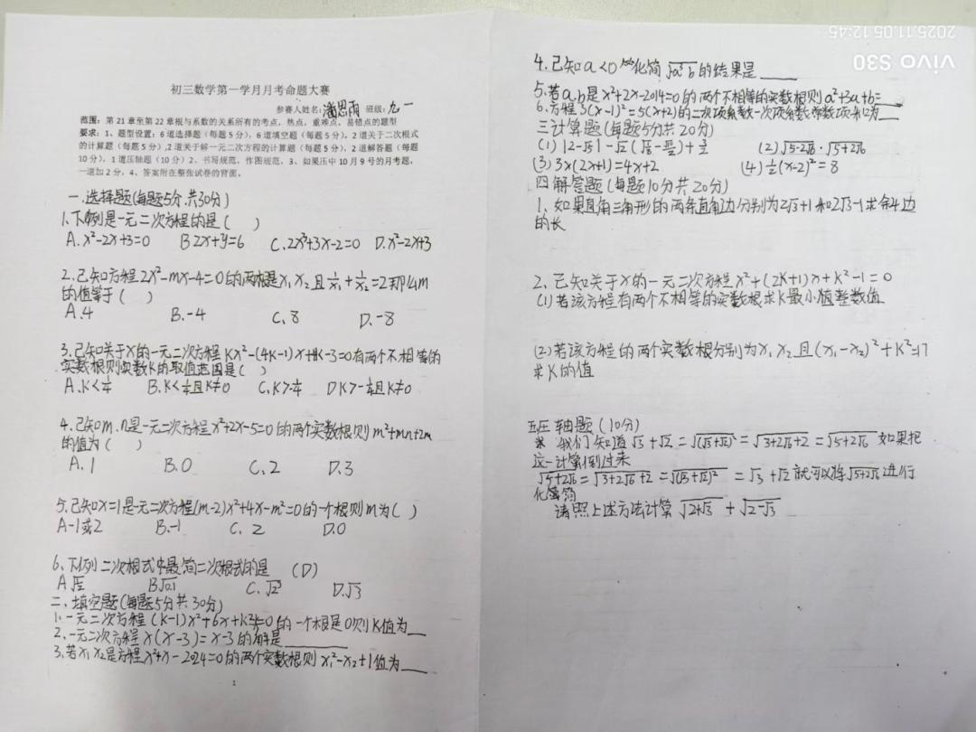 “从解题到命题,换个角度学数学”——命题设计大赛以第一学月知识为载体,鼓励学生变身“小命题人”。活动要求围绕初三数学核心知识点,自主设计兼具区分度与创新性的题目,并配套审题要点、解题思路及答案解析。这一过程中,学生不仅深化了对知识本质的把握,更培养了逆向思维与严谨的逻辑表达能力,实现了从“被动接受”到“主动建构”的转变。