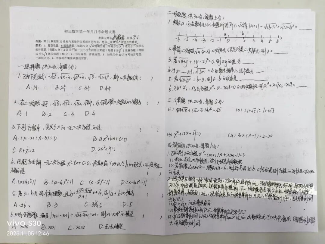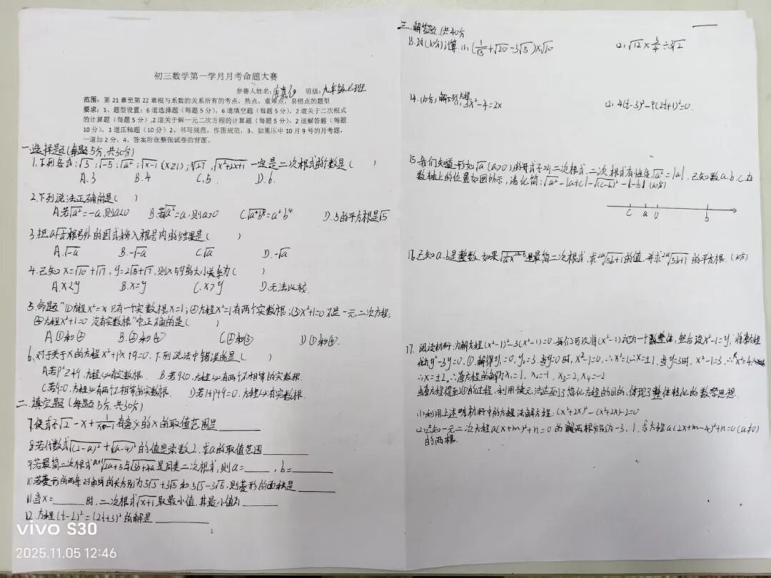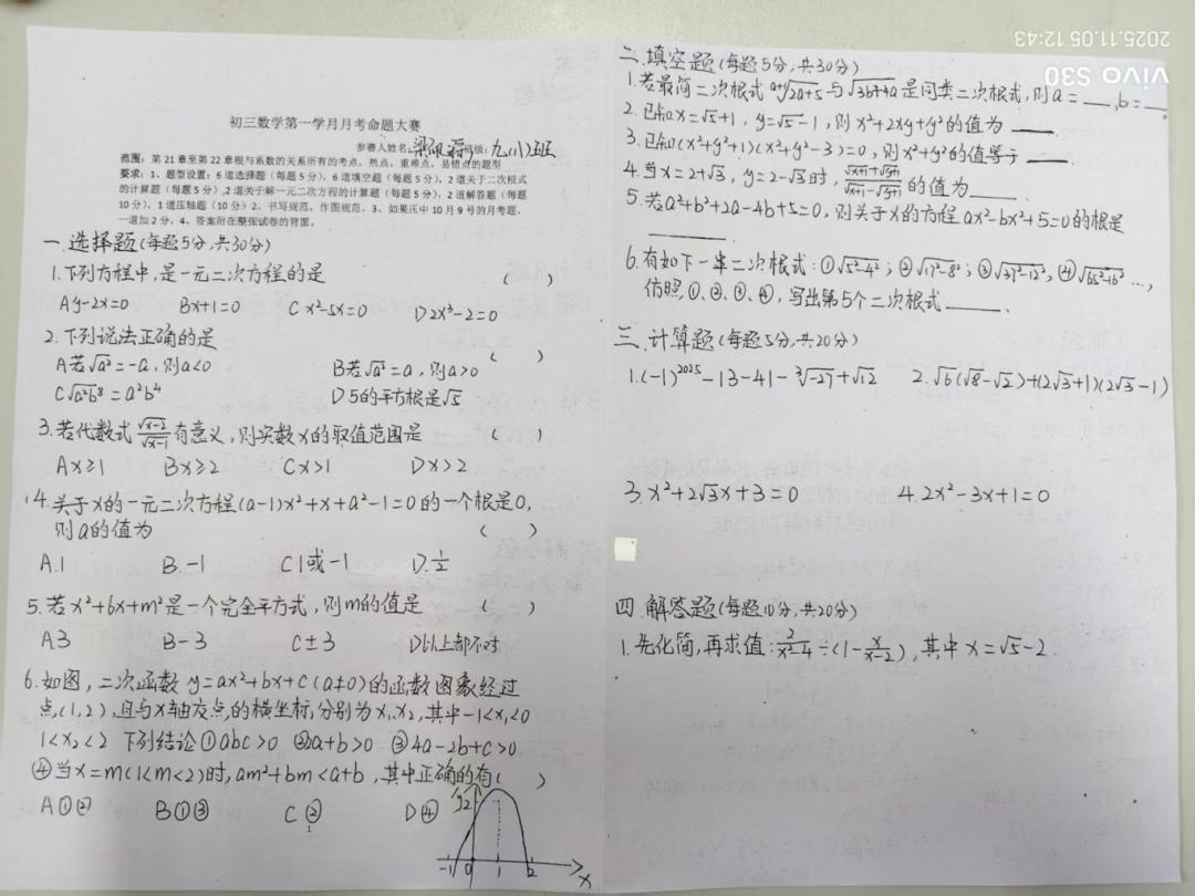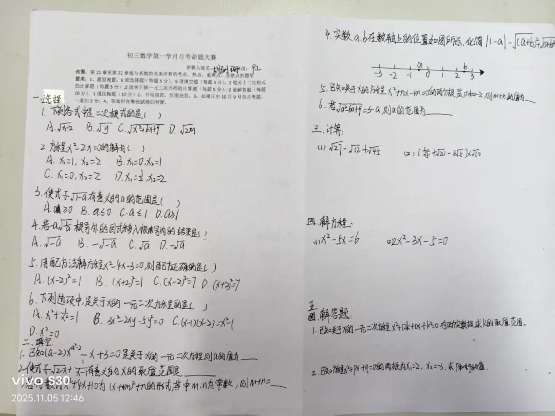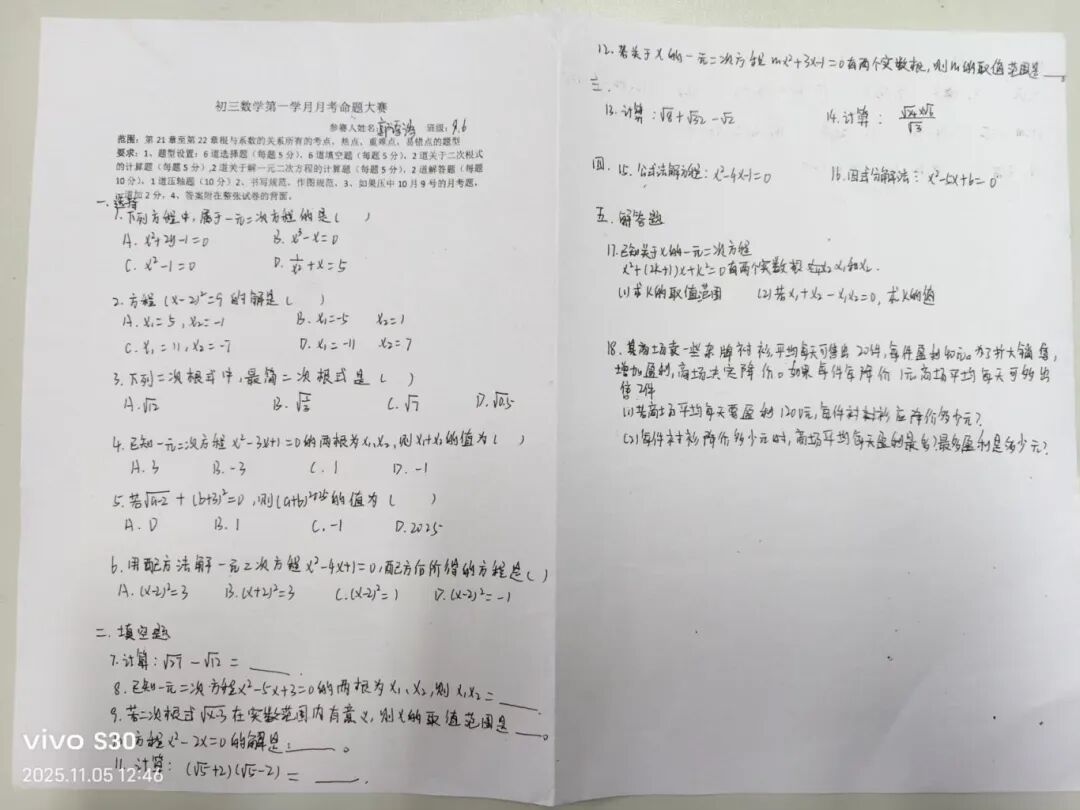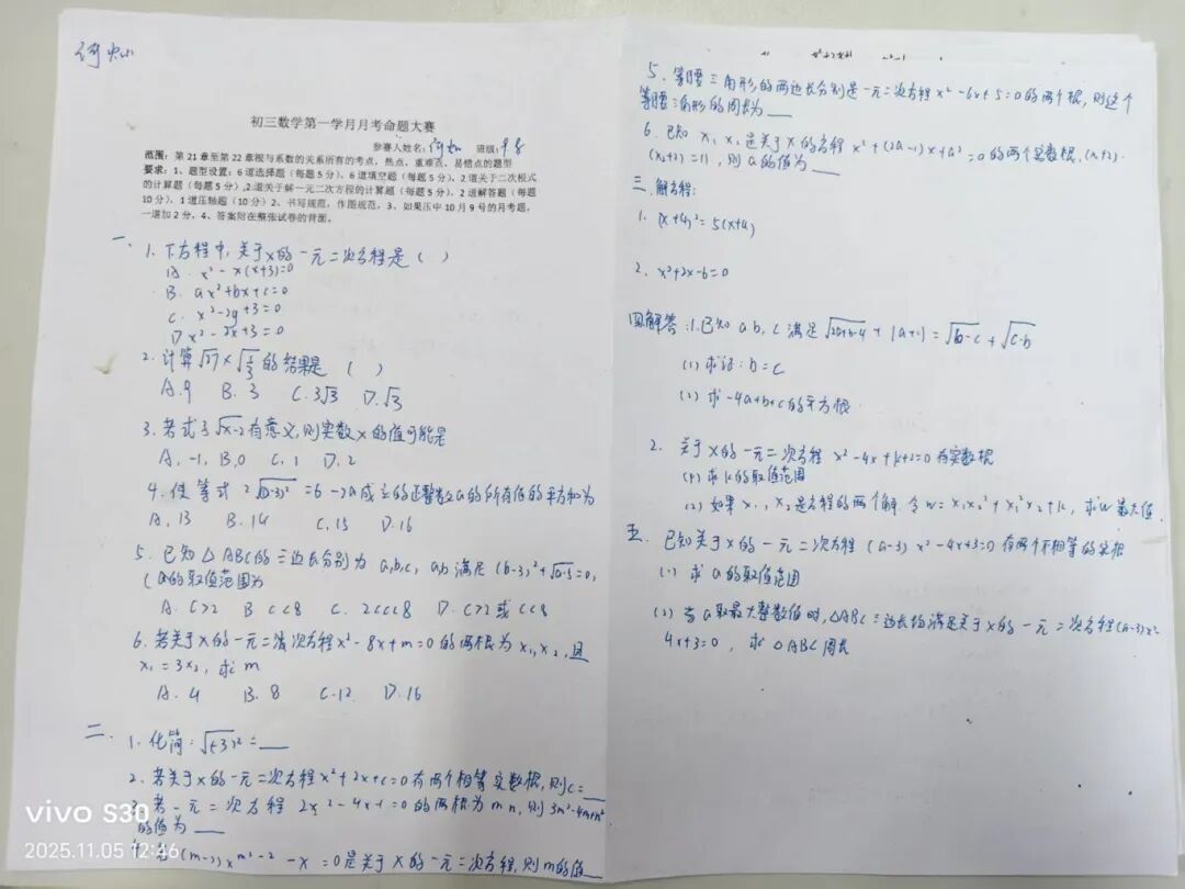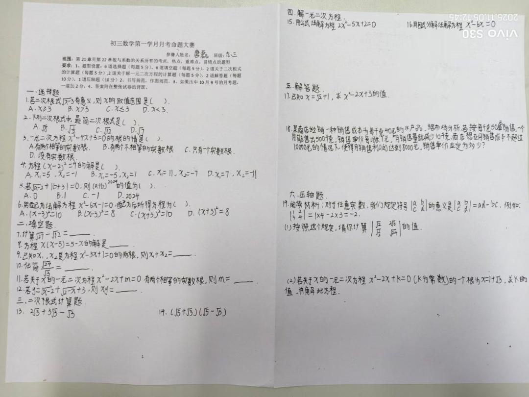 “从解题到命题,换个角度学数学”——命题设计大赛以第一学月知识为载体,鼓励学生变身“小命题人”。活动要求围绕初三数学核心知识点,自主设计兼具区分度与创新性的题目,并配套审题要点、解题思路及答案解析。这一过程中,学生不仅深化了对知识本质的把握,更培养了逆向思维与严谨的逻辑表达能力,实现了从“被动接受”到“主动建构”的转变。