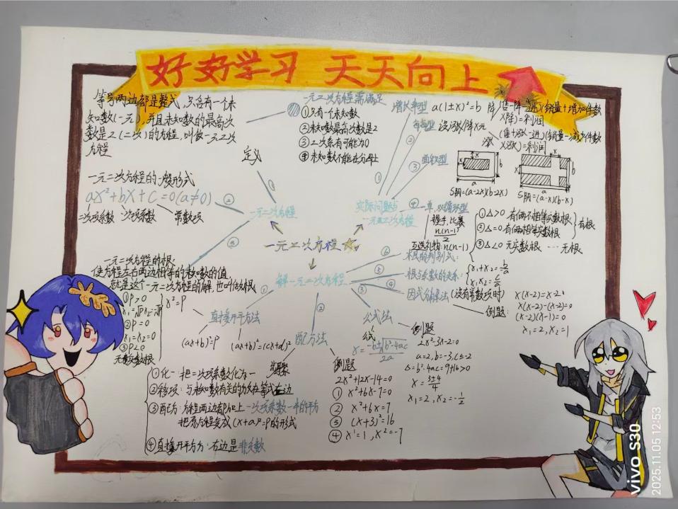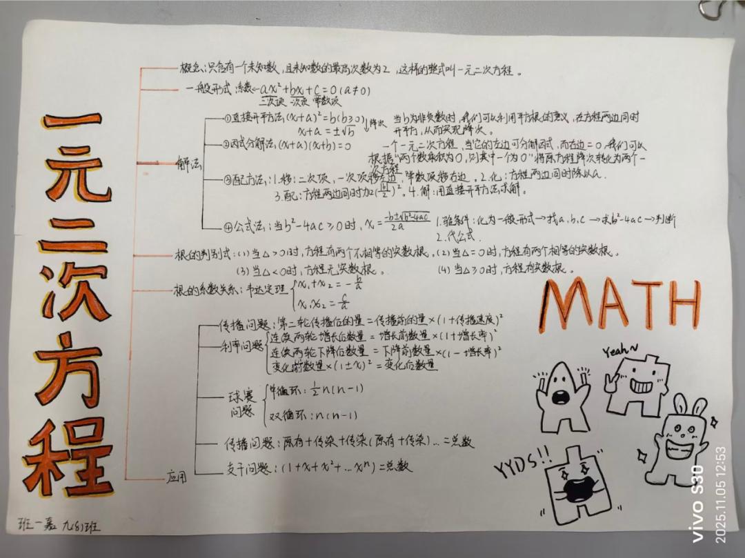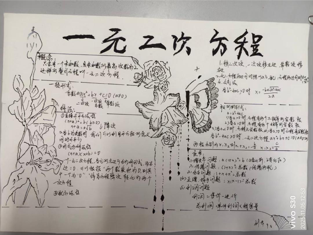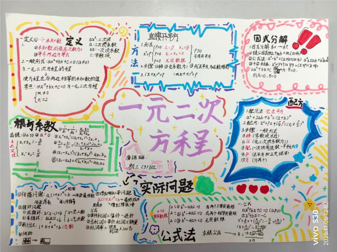以“一元二次方程”为核心的思维导图创作大赛,引导学生跳出单一知识点的局限,从概念内涵、公式推导、题型分类到实际应用,多角度梳理知识脉络。同学们积极构思、巧思设计,将抽象的数学逻辑转化为色彩鲜明、条理清晰的图形语言。一幅幅优秀作品不仅展现了完整的知识框架,更折射出对知识点的深度理解与灵活串联,让数学思维在笔尖绽放。