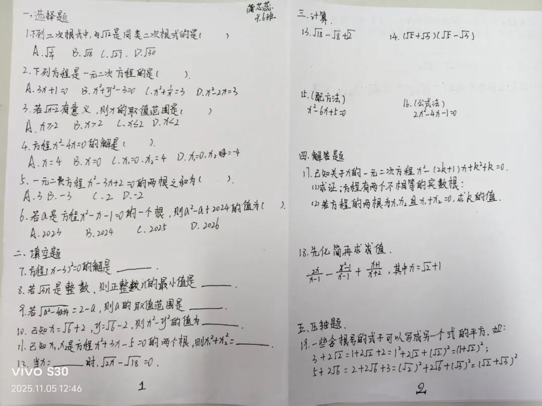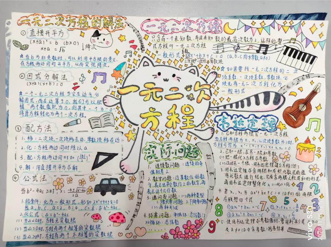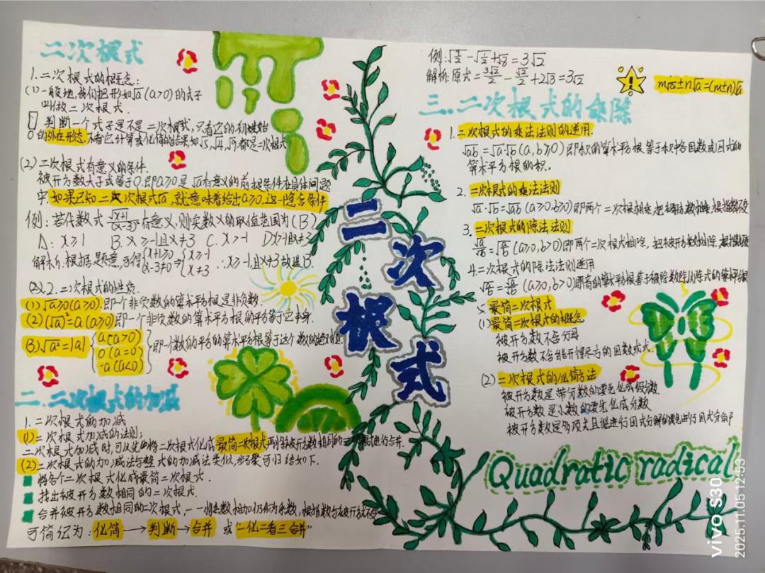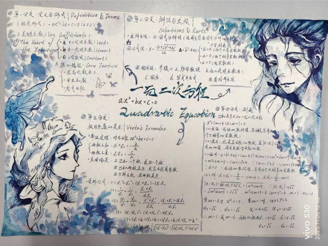 以“一元二次方程”为核心的思维导图创作大赛,引导学生跳出单一知识点的局限,从概念内涵、公式推导、题型分类到实际应用,多角度梳理知识脉络。同学们积极构思、巧思设计,将抽象的数学逻辑转化为色彩鲜明、条理清晰的图形语言。一幅幅优秀作品不仅展现了完整的知识框架,更折射出对知识点的深度理解与灵活串联,让数学思维在笔尖绽放。