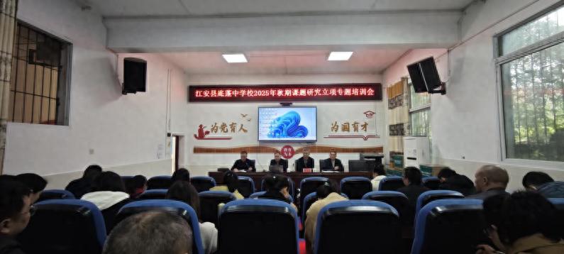 为提升教师课题研究能力,助力教师专业成长与职称评聘,11月24日下午,江安县底蓬中学校在阶梯教室召开了2025年秋期课题研究立项专题培训会。学校管理人员、各学科教研组长、备课组长及近三年拟评聘职称的教师参会。