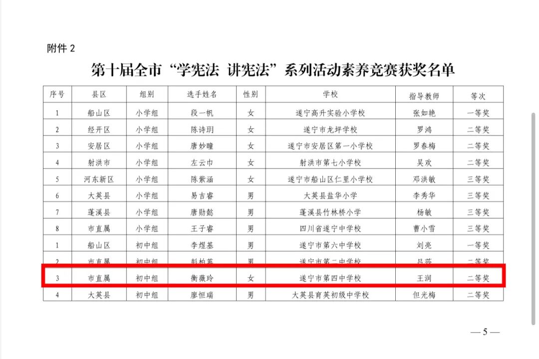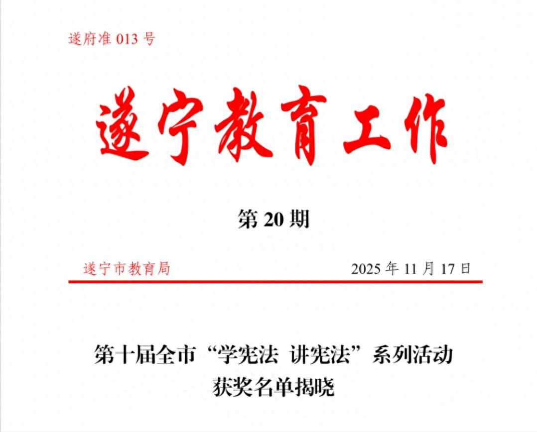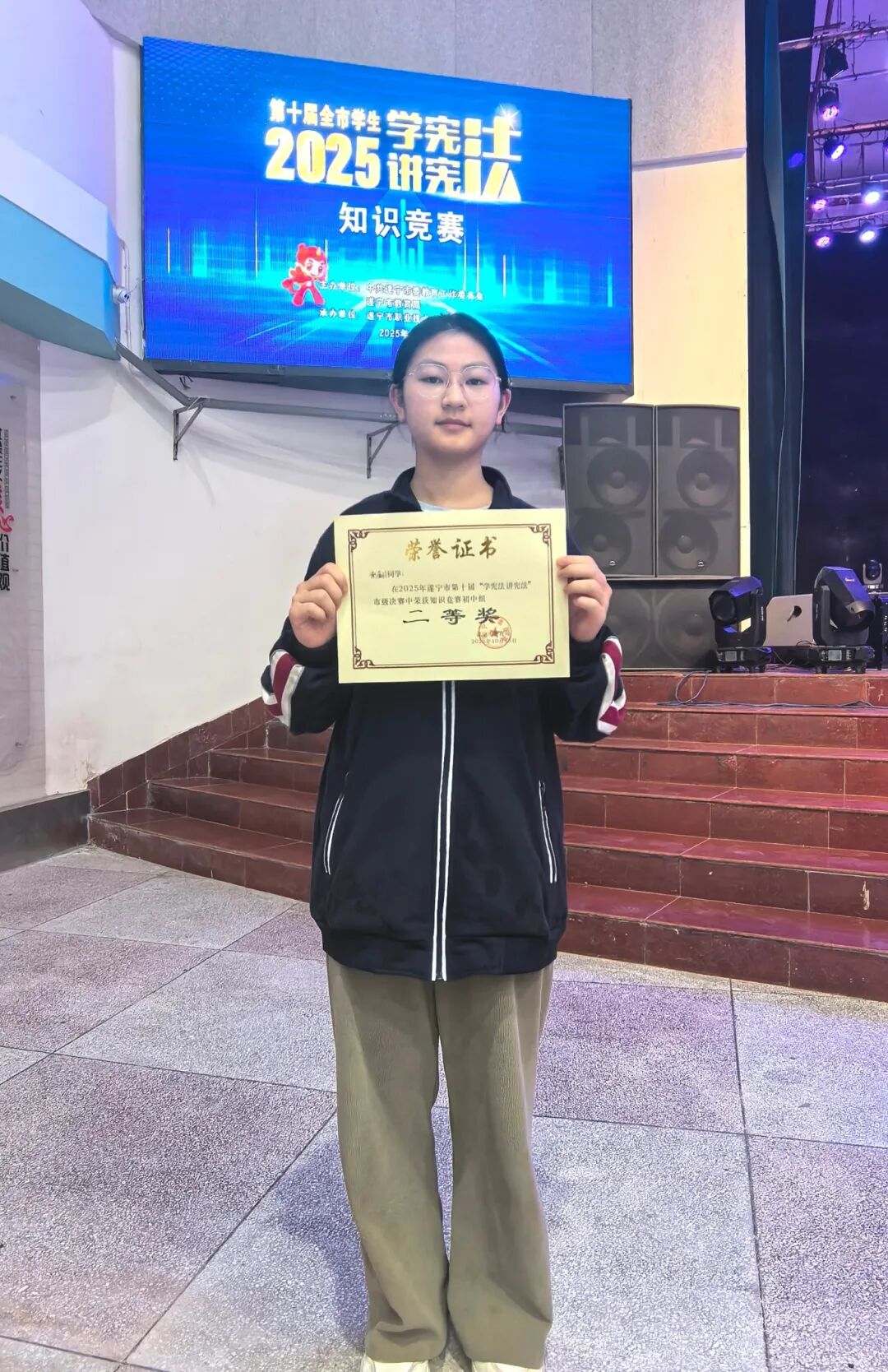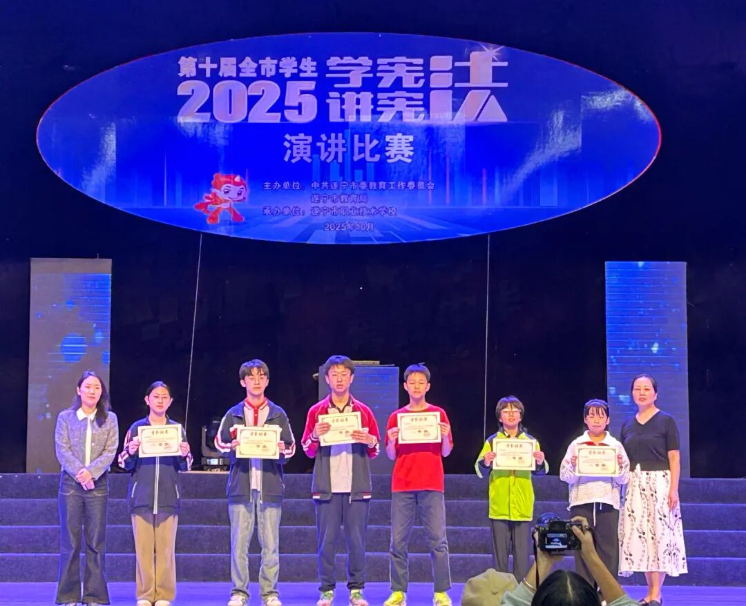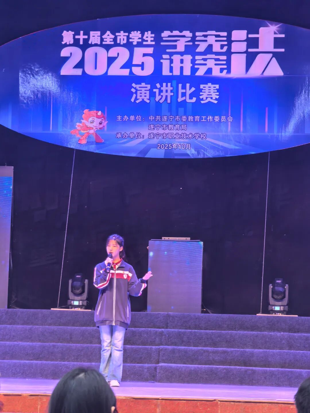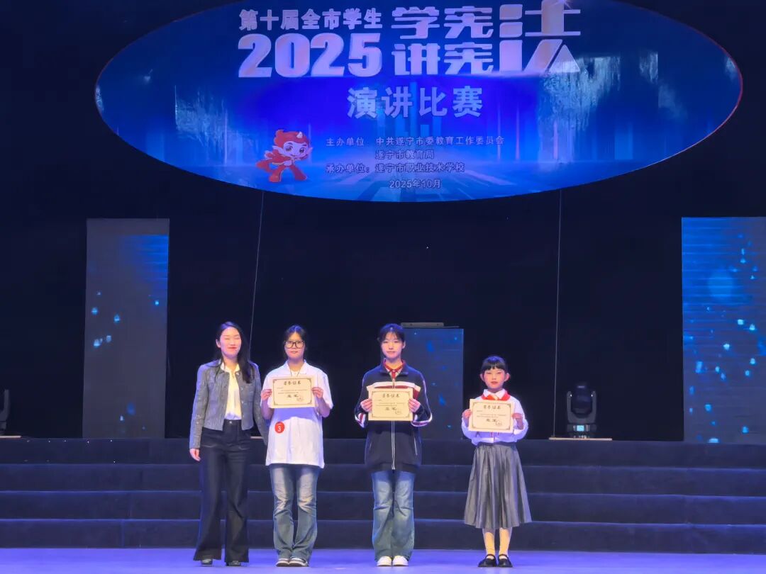演讲比赛初中组亚军段雅茹同学在2025年遂宁市第十届“学宪法 讲宪法”市级决赛中荣获演讲比赛初中组亚军知识竞赛初中组二等奖衡薇玲同学在2025年遂宁市第十届“学宪法 讲宪法”市级决赛中荣获知识竞赛初中组二等奖言传身教,让法治精神在少年心中生根发芽。赛前,魏容老师和王润老师悉心指导参赛选手。( 来源:遂宁四中 图文/李 敏)