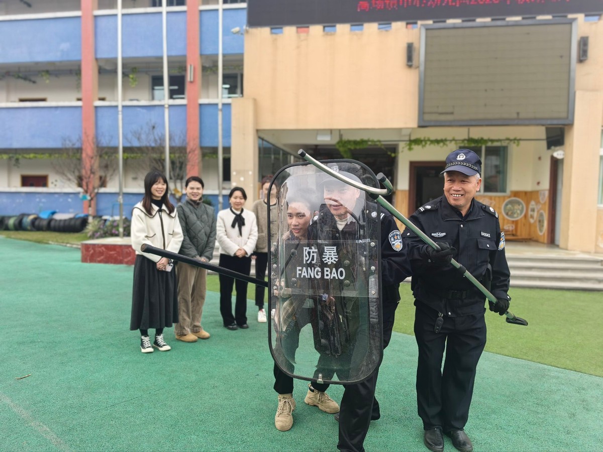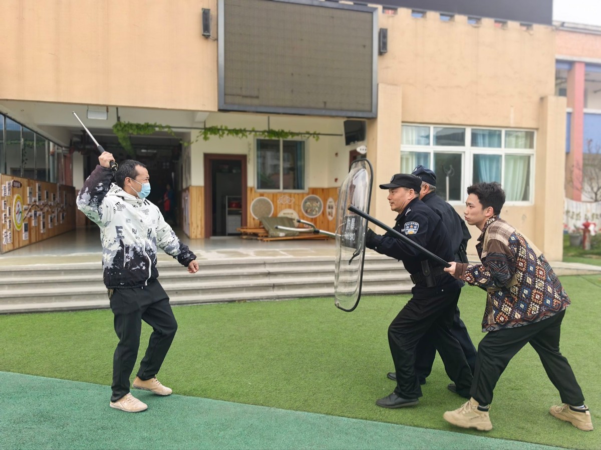 本次演练聚焦“实战化”要求。在培训环节,叙州区高场镇中心幼儿园安全员详细讲解了防暴盾牌、钢叉、长棍等器械的正确使用方法和协同配合战术,强化了“1分钟响应、3分钟处置、全员协同”的核心原则。随后模拟演练“歹徒”企图强闯校园的场景。安保人员发现后立即启动应急预案,一键报警并上前周旋。最小应急单元成员迅速集结并利用器械分工协作,成功将“歹徒”合围并制服,整个过程响应迅速、处置果断。