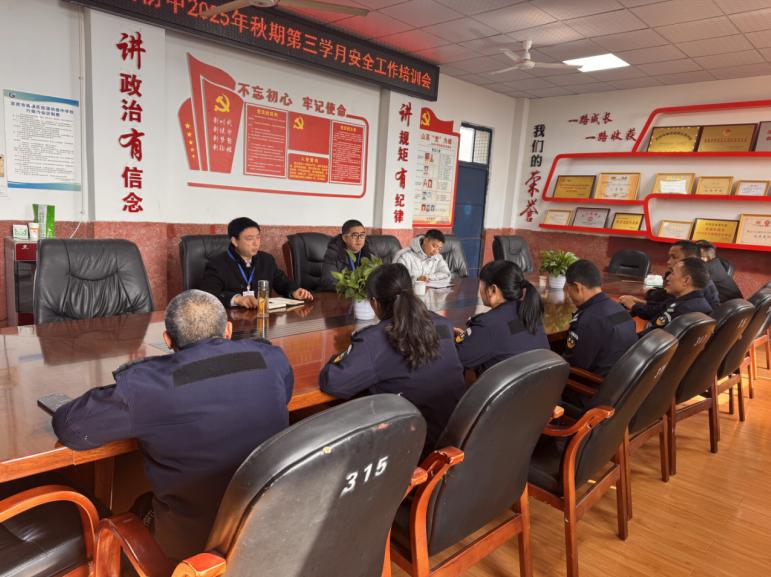 时至深秋,冬季将至,校园安全管理工作进入关键时期。为切实巩固校园安全防线,提升全体安保人员的安全责任意识与应急处置能力,确保学校教育教学秩序平稳有序,2025年11月25日上午,宜宾市南溪区桂溪初级中学校在行政会议室召开了第三学月安全工作培训会。学校分管安全副校长郭邦权、安保处主任黄保猛、后备干部雷志强及全体安保人员参加了本次会议,会议由郭邦权主持。
