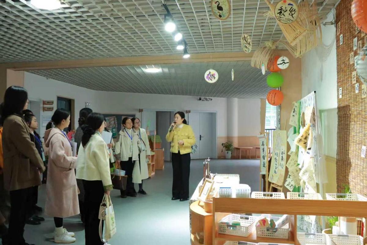 在园所环境观摩环节,保教主任刘小英带领跟岗教师实地参观了园所环境及功能室,细致讲解了园所环境创设理念、区域设置的教育意图、材料投放的层次性以及环境创设中蕴含的儿童视角。教师们频频驻足,就空间利用与课程融合等问题展开现场交流。
