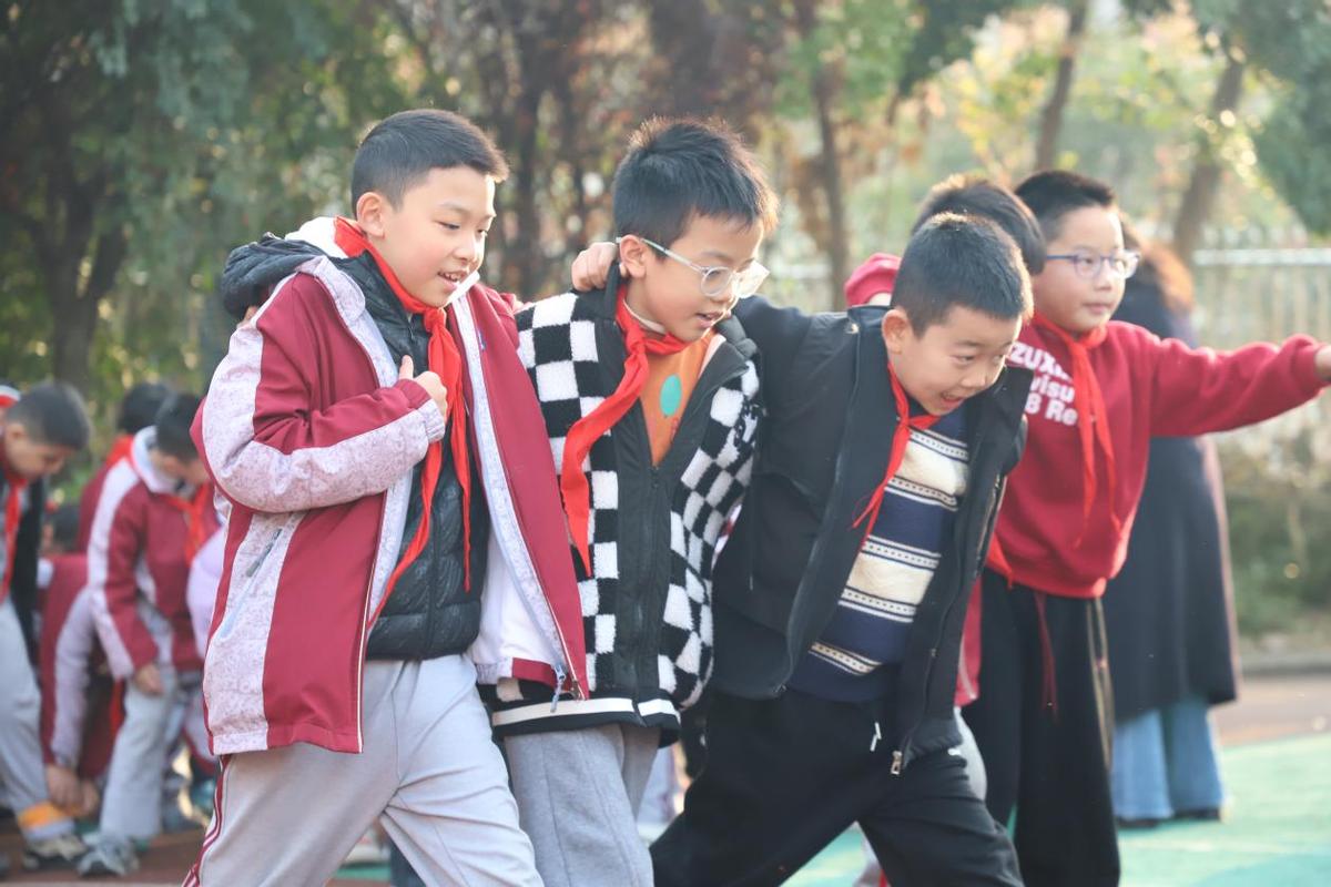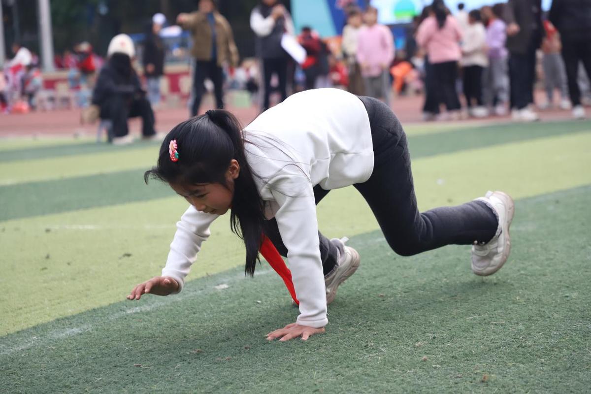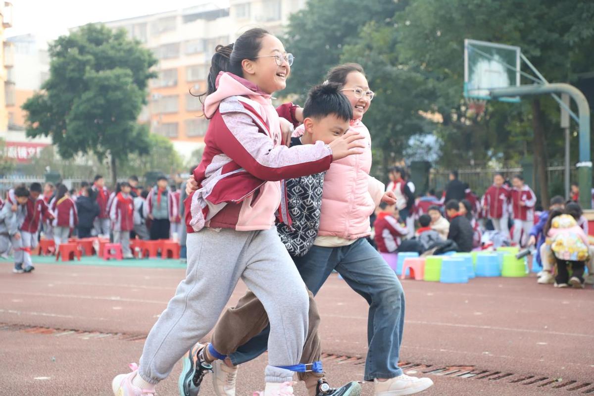运动的乐趣在此刻被具象化:低年级的“小青蛙过河”项目中,孩子们手脚并用、灵巧前行,憨态可掬的模样引来阵阵欢笑;中年级的“三人四足”现场,队员们并肩绑足、协调迈步,在响亮的号子声中默契前行;高年级的“地龙舟”和“齐心协力”环节更是精彩纷呈,整齐的步伐、响亮的口号,将比赛气氛一次次推向高潮。
