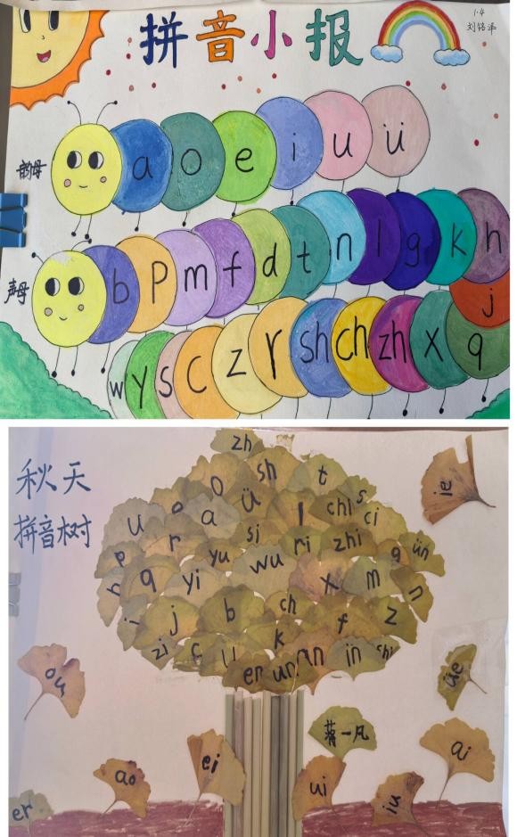 拼音王国里的三大家族:声母、韵母和整体认读音节在孩子们手里快乐地舞动,孩子们在绘制过程中进一步巩固了拼音知识,正所谓一举两得!你看,这一张张小报犹如一个个可爱的精灵正跳入我们的眼球,让我们好好欣赏一番吧!