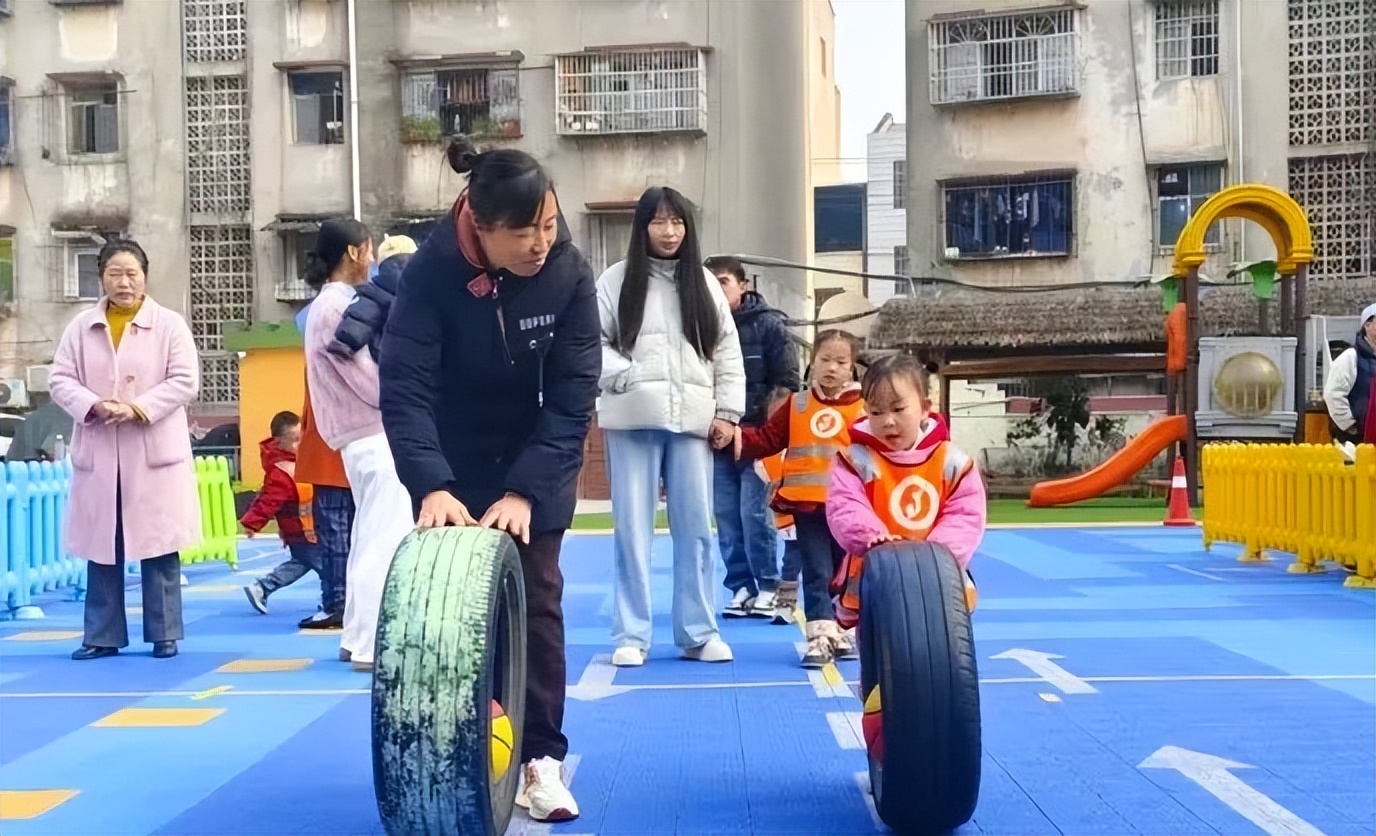 活动在轻松愉快的“快乐宝贝”亲子热身律动中进入高潮。在老师带领下,家长与孩子们携手跳动,默契配合,操场上洋溢着欢声笑语。随后的运动游戏环节更是精彩纷呈:“猪八戒背媳妇”趣味横生,“揪尾巴”考验亲子默契,“袋鼠跳”展现运动精神,“运果子”强调协作配合,“滚铁环”怀旧与挑战并存,“无敌风火轮”则成为操场上一道亮丽的风景线。家长协作项目“动力火车”更是将现场氛围推向高潮,充分展现了团队凝聚力。