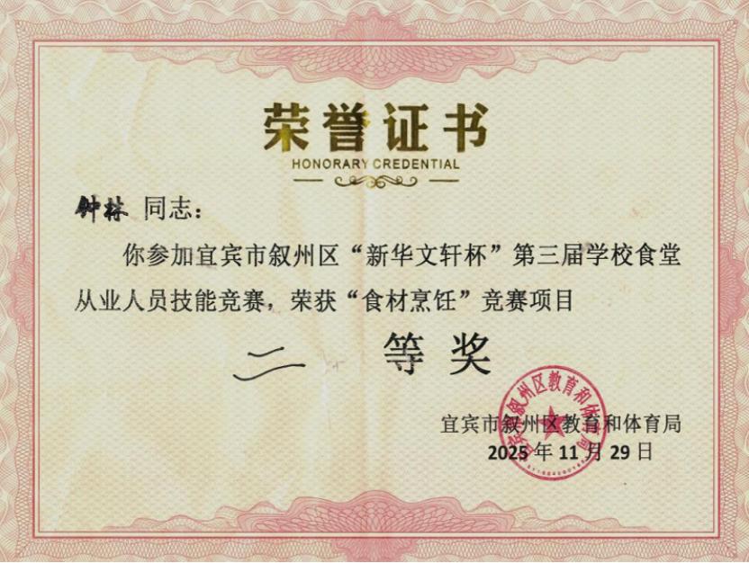 2025年11月29日,由宜宾市叙州区教育和体育局主办、“新华文轩” 冠名的第三届学校食堂从业人员技能竞赛顺利举行。全区各中小学食堂的优秀从业者齐聚赛场,展开厨艺与职业素养的同场竞技,宜宾市叙州区高场职业技术学校食堂从业人员钟林凭借扎实的实操能力与规范的操作流程,在竞赛中脱颖而出,斩获二等奖。