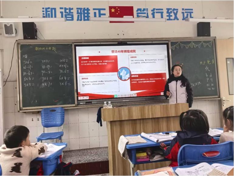 活动期间,南溪区黄沙镇中心小学校LED屏滚动播放宪法宣传标语,营造浓厚法治氛围。升旗仪式上,该校全体师生庄严肃立,在许老师带领下进行宪法晨读,跟读宪法条款。许老师阐述宪法作为国家根本大法的重要性,鼓励学生从小学习宪法,争做知法守法小公民。