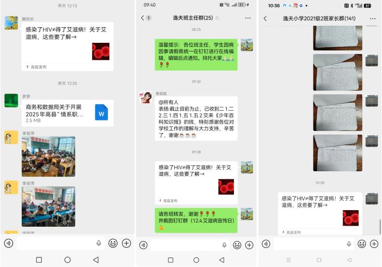 高县逸夫小学校班主任通过班级微信群向家长推送艾滋病防治知识手册与科普文章,内容涵盖家庭防艾注意事项、如何引导孩子树立健康生活方式等实用信息。同时倡导家长主动学习防艾知识,与学校携手关注孩子身心健康,让防艾宣传延伸至每个家庭。