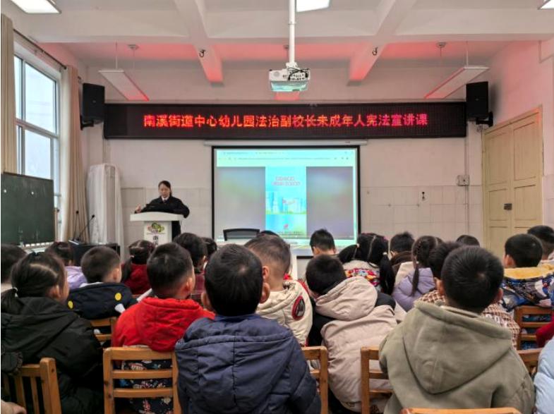 活动中,南溪区南溪街道中心幼儿园法治副校长陈希通过展示精心准备的卡通图片、播放简短的普法动画片,以及互动问答等形式,用充满童趣的语言和形象生动的比喻,向孩子们介绍了宪法是什么;引导孩子们初步了解了宪法的重要性,从幼儿园的日常行为规范到国家的法律,都是为了让我们的生活更有秩序、更安全,孩子们听得津津有味,积极参与互动,在轻松愉快的氛围中对“法”有了最初的美好印象。