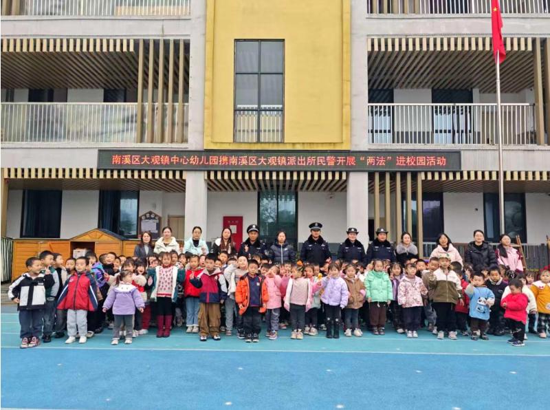 为增强幼儿自我保护意识,筑牢校园安全屏障,2025年12月2日,宜宾市南溪区大观镇中心幼儿园联合宜宾市公安局南溪区分局大观派出所开展了《预防未成年人犯罪法》《未成年人保护法》(以下简称“两法”)进校园活动,用生动有趣的方式为孩子们送上一堂特殊的“法治课”。