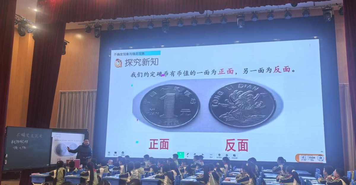南溪区长江学校四年级组陈国超老师执教的《不确定现象》,以孩子们熟悉的学校体育节为切入点,通过抛硬币、摸球等多种互动游戏,引导学生观察和体验生活中的不确定现象,让孩子们实现“玩中学,学中乐”。