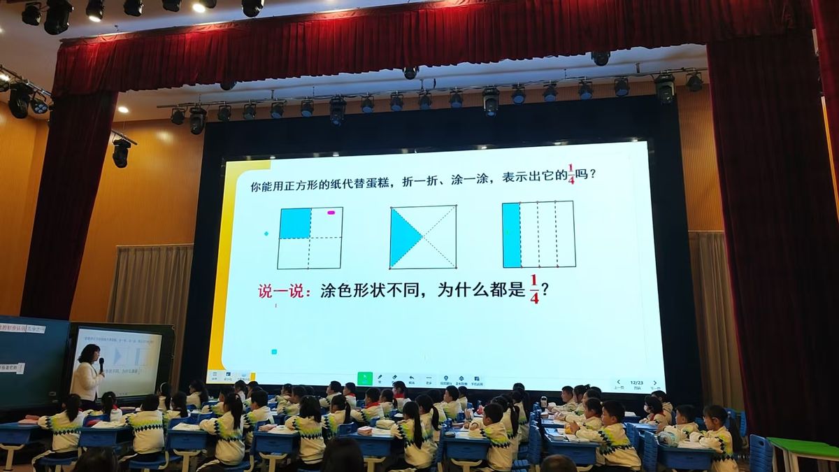 南溪区长江学校三年级组施水仙执教的《分数的初步认识》采用了“情境教学法+操作探究法+直观演示法”,凸显“以生为本”的教学理念。通过分一分、折一折、涂一涂等活动激发学生兴趣。将抽象的分数概念转化为可操作的具体形象。