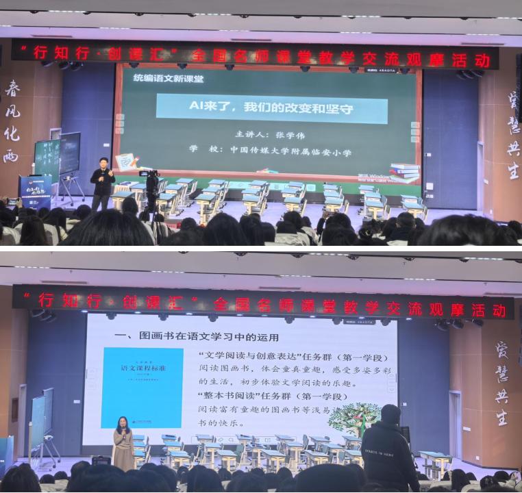 专题讲座环节同样精彩纷呈理论引领与实践指导并重。王文丽老师围绕“守正与创新”这一核心主题,阐述了语文课堂如何在继承优秀传统中实现突破;曹爱卫老师则以《红色经典课文教学要义》为题,深入剖析了此类文本的育人价值与实施策略。张学青老师系统分享《低年级图画书阅读课程的设计与实践》,为绘本阅读教学提供清晰的课堂化路径。张学伟老师在专题报告《AI来了,我们的坚守与创新》中,更引发教师们对技术时代语文教学本真的集体思考。