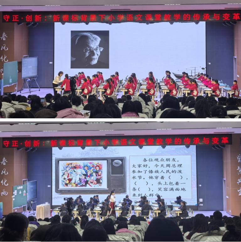 本次活动汇聚全国多位语文名师,课堂展示涵盖不同文体与学段,呈现语文教学的多元样态。王文丽老师执教《父爱之舟》,以细腻深入的文本解读,引导学生触摸散文的情感脉络;曹爱卫老师呈现的《刘胡兰》,让红色经典在低段课堂中自然扎根,感人至深;班悦老师执教的《难忘的泼水节》,则通过情境创设与语言实践活动,生动传递民族文化的魅力;张学伟老师通过《少年闰土》,精彩演绎了小说教学中思辨能力的培养路径;张学青老师带来的二年级绘本教学《第一次上街买东西》,巧妙结合图文,激发低年级学生的表达与想象。