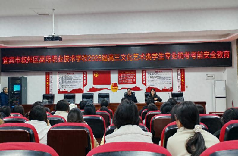 为进一步凝聚备考共识、强化安全管理,助力高三文化艺术类学子以最佳状态迎战专业考试,近日,宜宾市叙州区高场职业技术学校召开了高三文化艺术类统考考前动员会暨送考安全工作会。学校党总支副书记李承斌、教务处副主任及全体高三文化艺术类专业任课教师和学生参加会议。