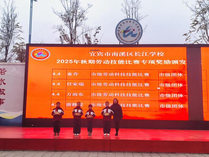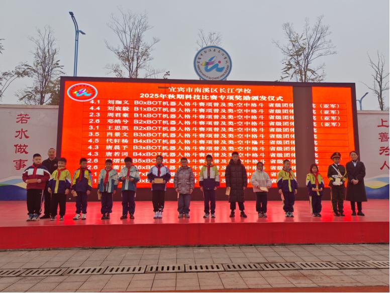 展示环节后,南溪区长江学校举行了德育与科技竞赛专项颁奖仪式。省级B1xBOT机器人格斗赛团体一等奖(亚军)、市级劳动科技技能比赛团体一等奖、区级演讲比赛一等奖、区级课本剧团体二等奖。一张张奖状,承载着学子们在德育修养、科技实践与综合素质上的全面发展。