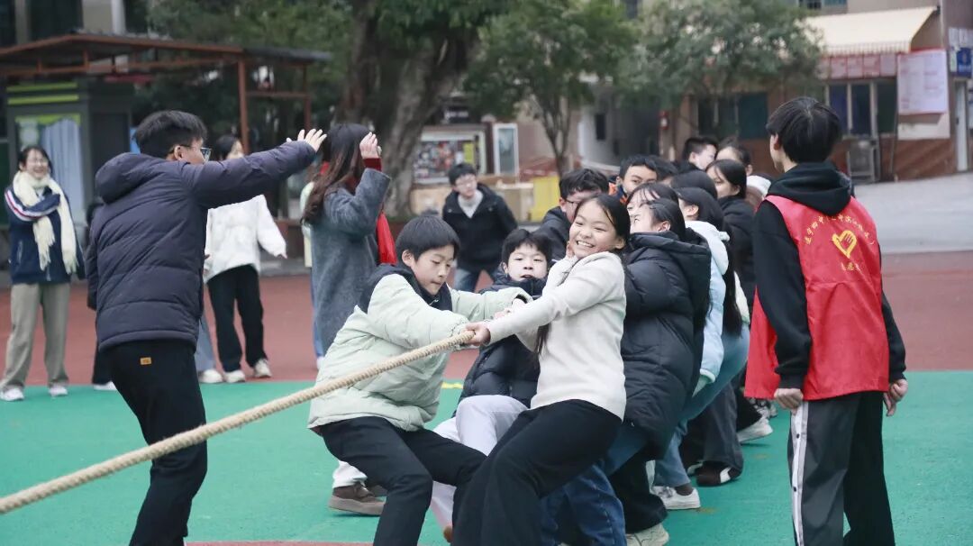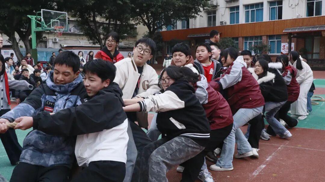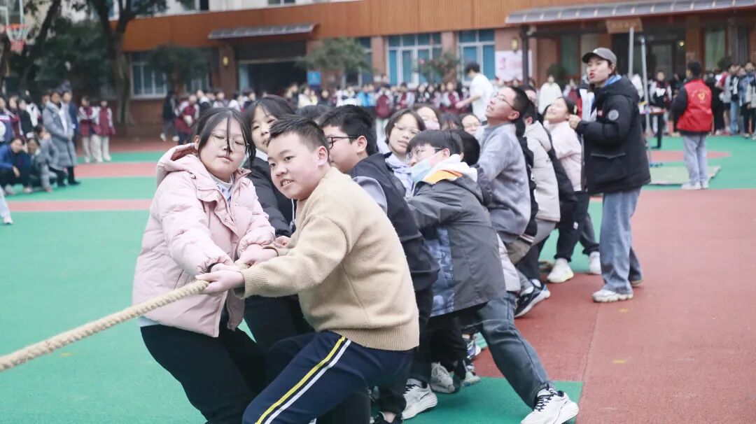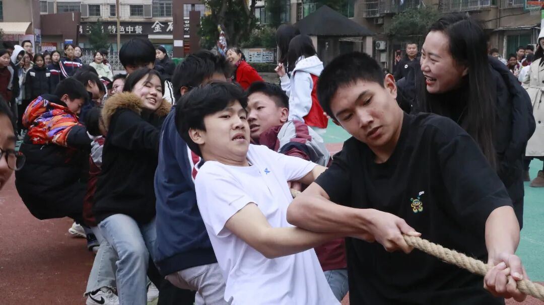 拔河比赛中,各班运动员紧握长绳,团结一心,寸土必争,场边的加油声此起彼伏,展现了无与伦比的班级凝聚力。