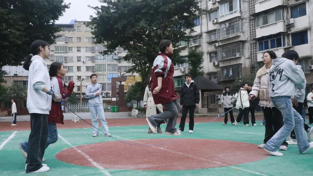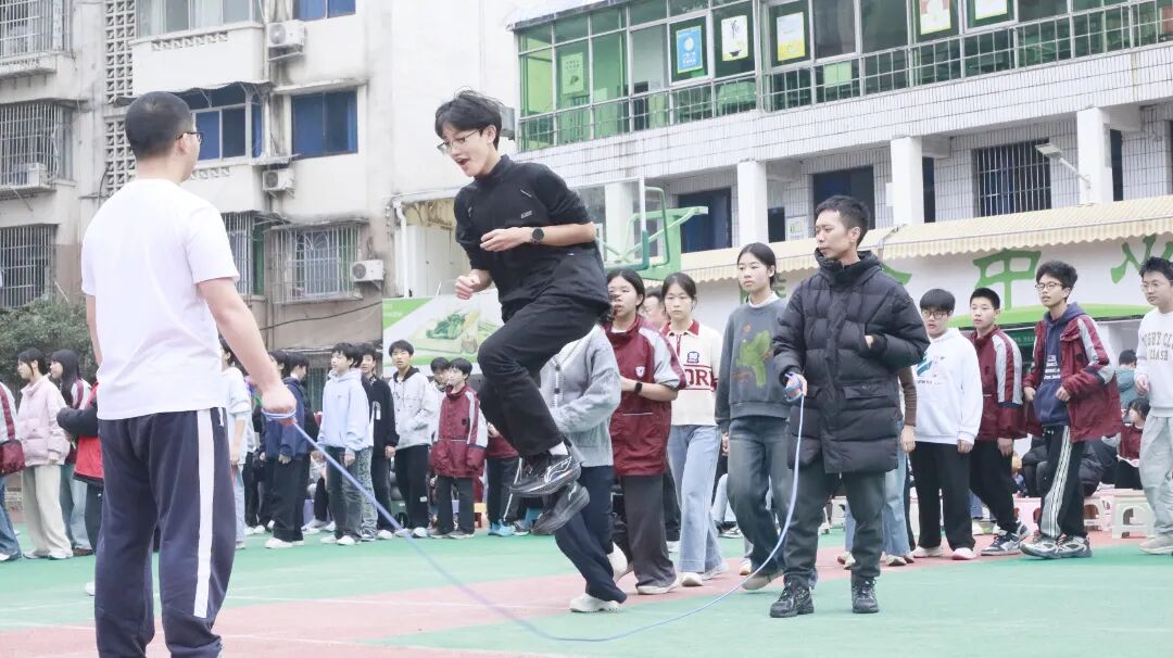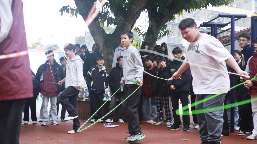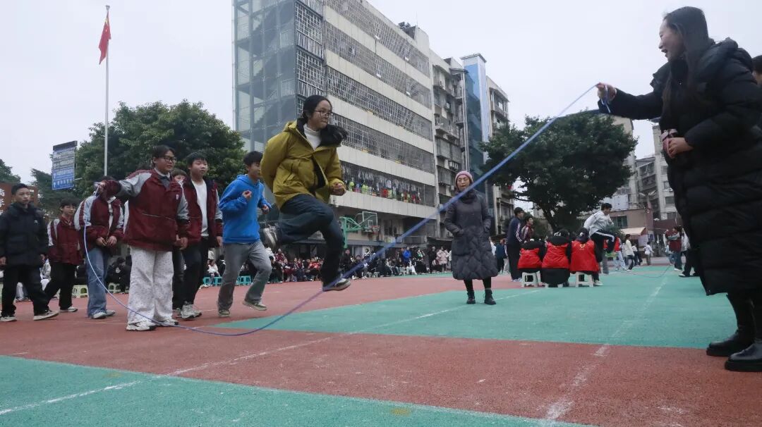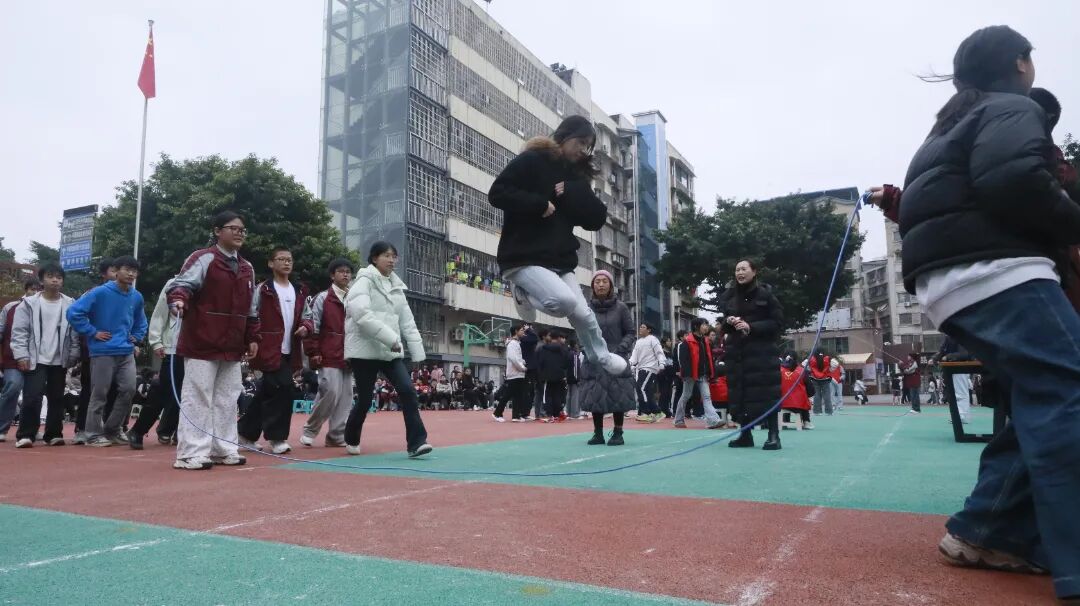 最富趣味性的三分钟8字跳绳项目,每班跳绳队员与摇绳队员配合无间,师生同乐,长绳飞舞,人影穿梭,构成了一幅和谐而充满活力的动人画卷。
