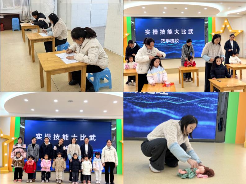 比赛分为理论考试与现场操作两大环节。理论考试涵盖保育知识、卫生消毒、应急处理等内容;现场操作则设置“应急情况处理”与“巧手梳妆”两个项目,考验保育员在实际工作中的应变能力、操作规范与人文关怀。比赛中,高县罗场镇幼儿园保育员们沉着应对、熟练操作,展现了扎实的专业功底和细致的保育精神。