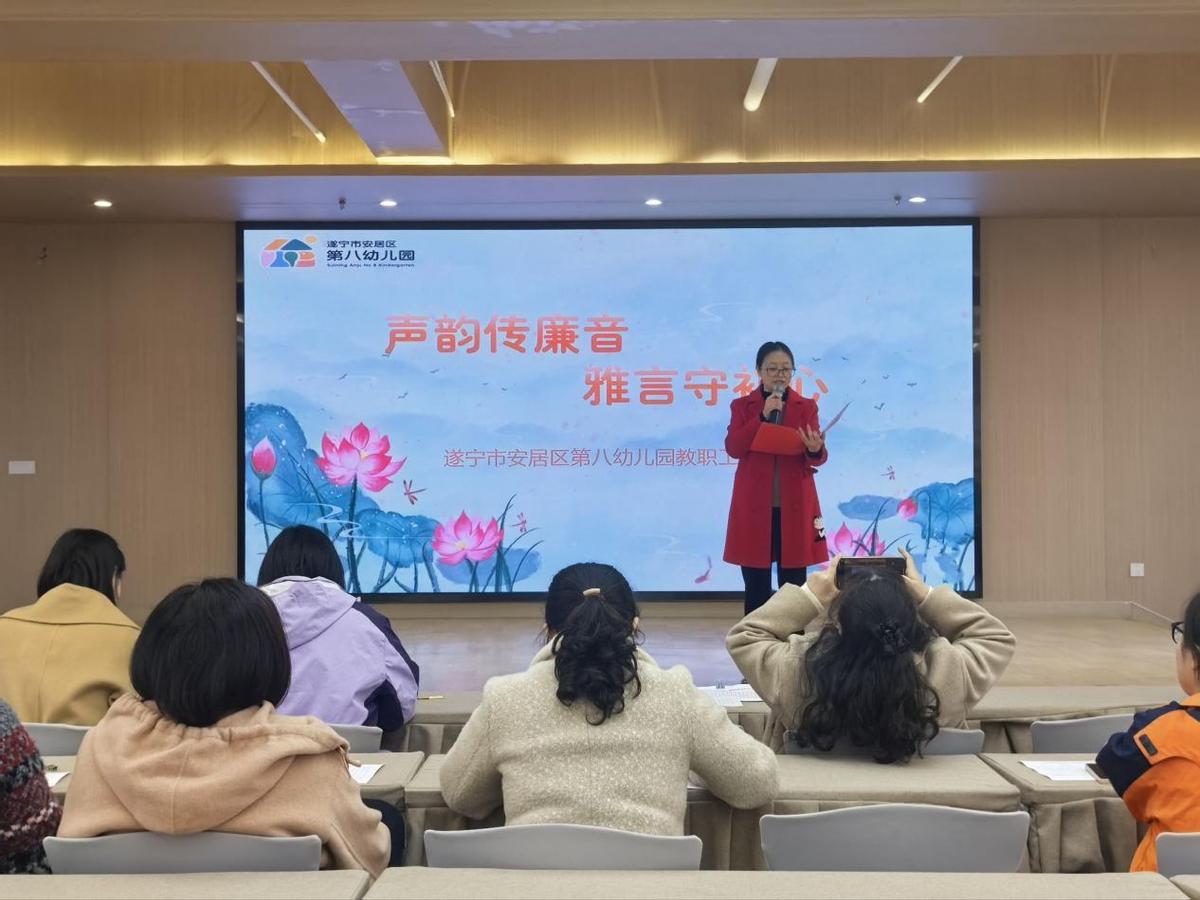 为响应国家推普政策与师德师风建设要求,强化教师廉洁从教意识,提升语言表达能力,11月24日下午,遂宁市安居区第八幼儿园在三楼会议室成功举办 2025年秋季“推普 + 廉政主题朗诵活动,全体教职工积极参与。