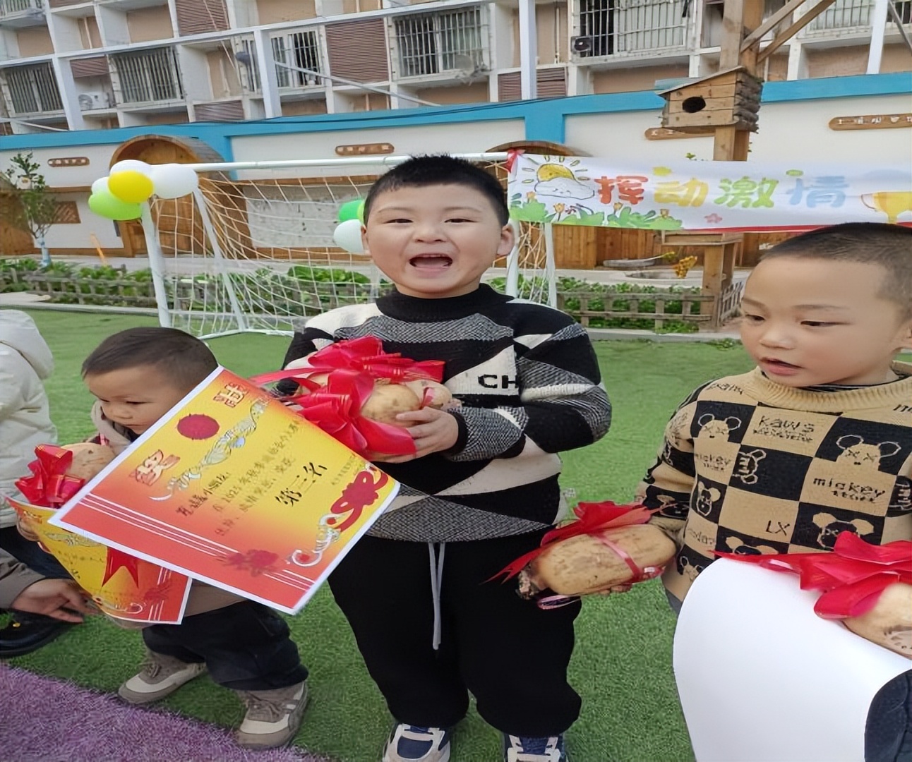 个人赛:各班幼儿依次角逐投沙包、跳圈、踩高跷和跳绳等项目,小小的身影在赛场上全力冲刺。经过半天的激烈角逐,运动会在颁奖仪式中圆满落幕。每个孩子都获得了属于自己的荣誉,灿烂的笑容绽放在红扑扑的小脸上。