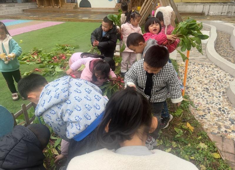 采收现场,孩子们在教师的带领下,化身 “小小采收员”,带着好奇与兴奋走进种植园。大家分工合作,有的拔萝卜、有的运萝卜、有的细心清理泥土、有的比较萝卜的大小,忙得不亦乐乎,脸上洋溢着丰收的自豪与喜悦。随后,孩子们将收获的萝卜清理干净,一部分用于班级自然角展示观察,一部分带回家制作成美味的凉拌萝卜、萝卜汤,在品尝自己劳动果实的过程中,更深切地懂得了 “珍惜粮食” 的内涵。