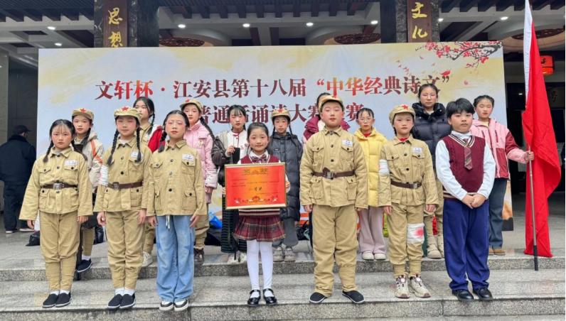 2025年12月16日上午,江安县阳春镇白沙小学校教师徐慧琳、赵镜境带领郑雅雯、刘浩天、龙洋、潘艺嘉等16名学生在江安剧场参加了文轩杯·江安县第十八届“中华经典诗文”普通话诵读大赛决赛。
