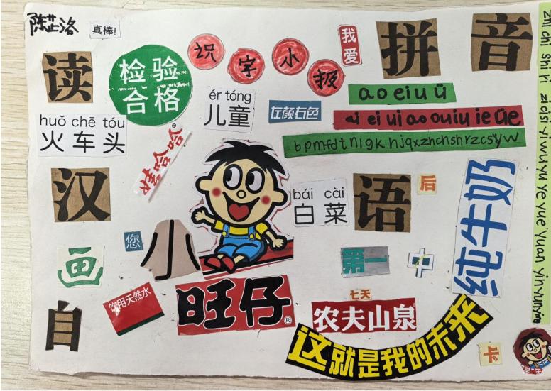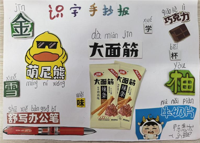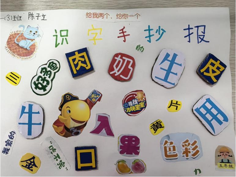 在充分搜集和认识生活中的汉字后,孩子们充分发挥想象力与创造力,将收获的成果精心制作成了一张张图文并茂、个性十足的“识字小报”。小报上,既有剪贴的实物标签,也有亲手绘制的图画;既有端正书写的汉字,也有拼音注解。每一张小报都色彩斑斓、充满童趣,清晰地记录了孩子们主动探索的过程和收获的喜悦,展现了他们观察生活、自主学习的能力。