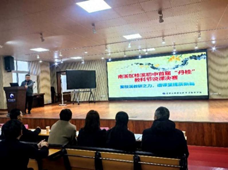 为深化课堂教学改革,夯实教研赋能根基,凝聚教师专业成长合力,2025年12月12日,宜宾市南溪区桂溪初级中学校首届“丹桂”教科节说课决赛在学校多功能报告厅举行。本次活动以“聚桂溪教研之力,谱课堂提质新篇”为核心导向,紧扣学科教学重难点,聚焦教学设计创新与教学实效提升,为全校教师搭建了展示教学智慧、交流教研心得的优质平台,来自多个学科的参赛教师,以饱满的热情、扎实的专业功底,围绕教材解读、学情分析、教学目标设定、教学过程设计、板书布局、作业分层等核心环节展开说课。