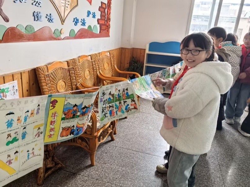 展览期间,展厅内始终人流络绎。驻足其间的学生们时而低声交流画中细节,时而围绕导图讨论故事逻辑。五年级语文教师介绍,本次活动将“读、写、绘、思”融为一体,引导学生在理解文本的基础上进行视觉化创作与结构化梳理。“这不仅是一次学科实践,更是一场文化启蒙。孩子们在笔触间贴近民间智慧,在构图时领会叙事逻辑,经典故事也因此真正走进他们的精神世界。”