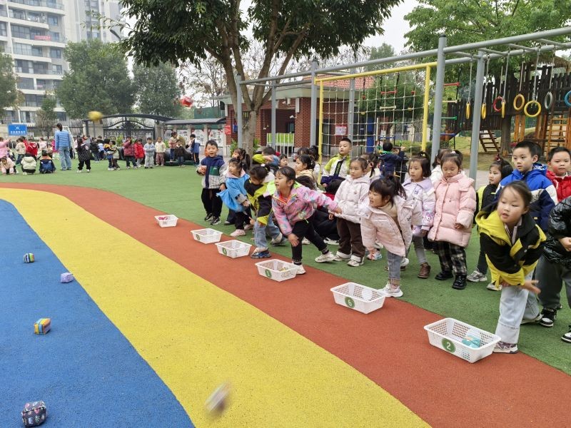 最后一个项目是扔沙包,宝贝们一个个跃跃欲试。他们单手高举沙包,双脚分开站稳,身体微微后倾,然后用力向前一扔,沙包在空中划出一道优美的弧线,朝着目标飞去。