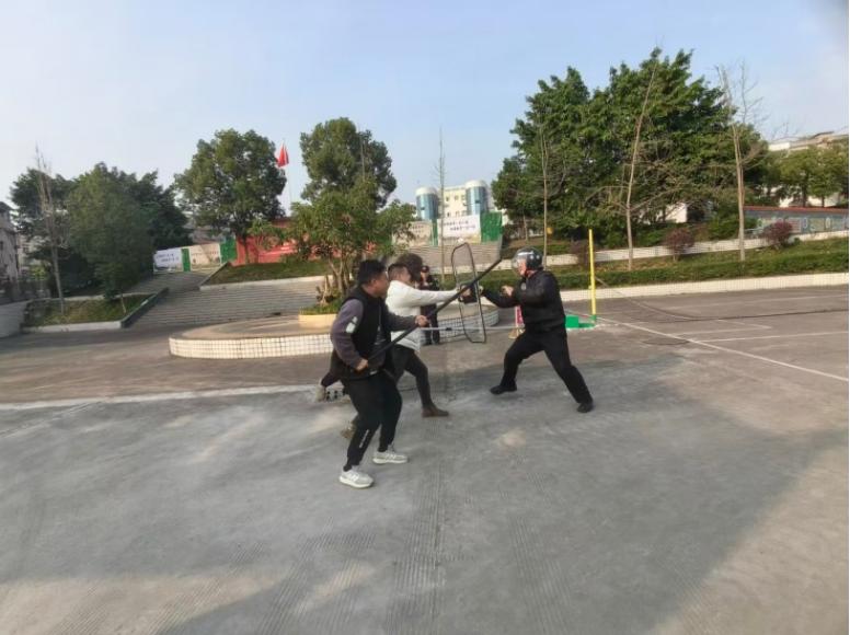 为进一步强化校园安全防范能力,提升教职工与安保人员应对突发暴力事件的处置水平,2025年12月18日上午,江安县阳春镇白沙小学校组织开展了校园防暴应急演练活动。学校应急组由教师、安保人员全程参与,江安县阳春镇派出所副所长侯业强带队亲临现场指导并进行实操演示。