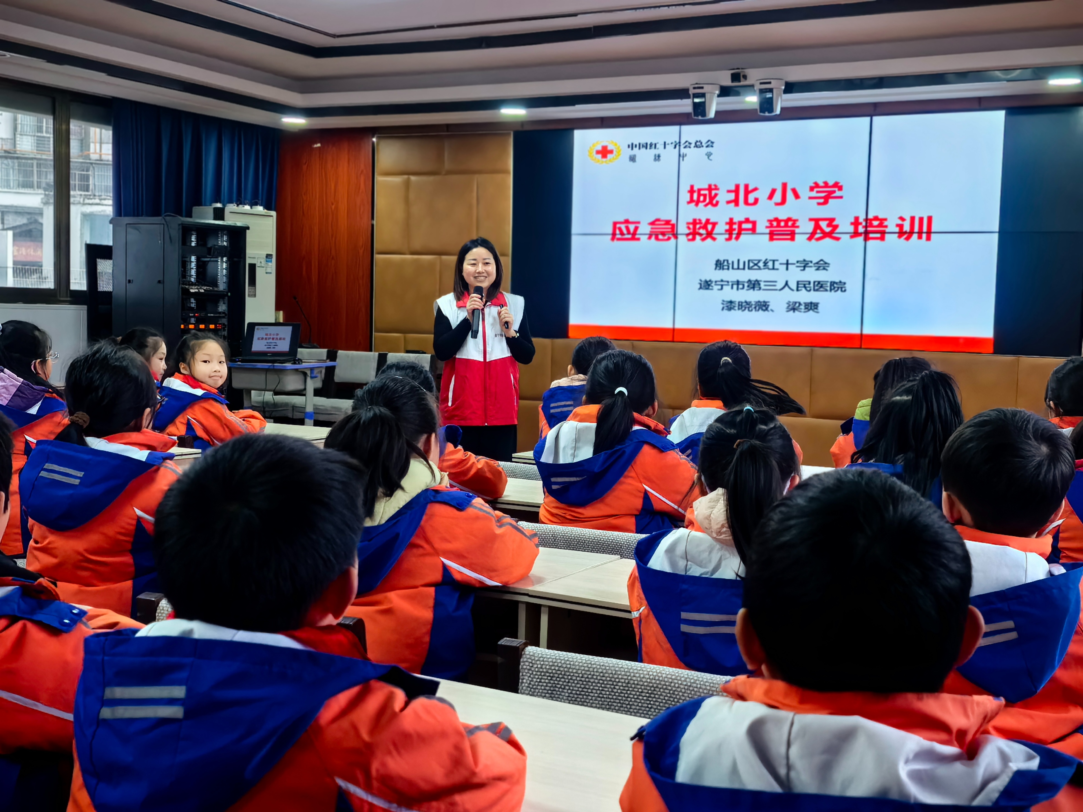 为筑牢校园安全防线,提升师生应对突发状况的自救互救能力,近日,在奉小辉校长的统筹部署下,遂宁市船山区城北小学邀请红十字会党组书记、常务副会长王小荣、遂宁市第三人民医院漆晓微医生及护士梁爽,带来了一场干货满满的急救知识培训,本次培训通过现场加直播的形式,全覆盖地让“人人学急救,急救为人人”的理念深植校园。