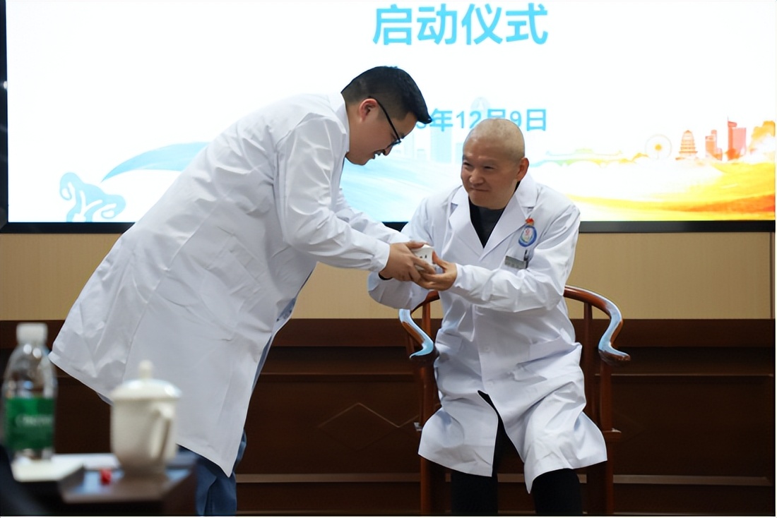 启动仪式上,区卫健局副局长卢玉琴为彭华专家工作室授牌,徒弟代表罗翔向师父彭华敬茶鞠躬,完成庄重的拜师礼,传承医学使命。