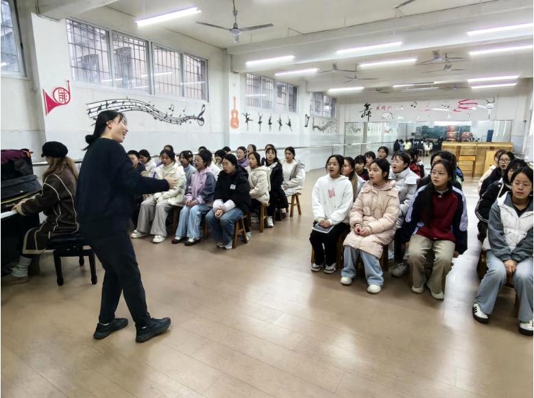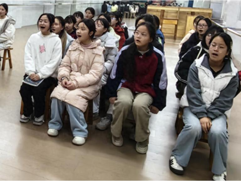 钢琴前奏响起,同学们迅速进入状态。在郭雯月老师和付明月老师的指导下,他们从练声开始,逐步打磨每一句旋律。不同的声部——高声部清亮,低声部浑厚——彼此配合,交织成丰富而动人的和声。在这里,唱歌不仅仅是个人才艺的展示,更是一门需要专注倾听、紧密协作的团队艺术。