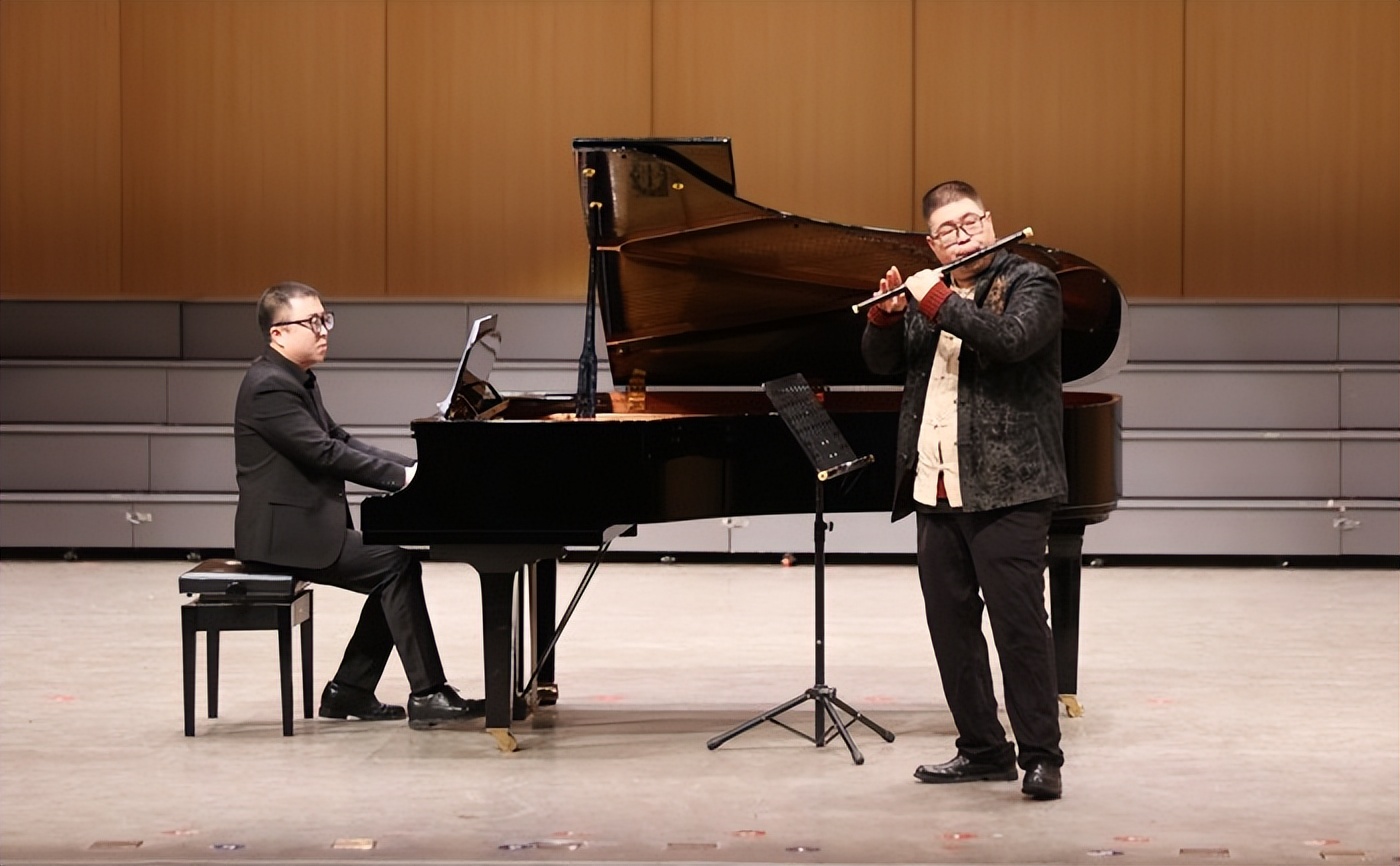 竹笛系列表演成为整场音乐会的特色亮点。李宝财与2024级音乐教育专业学生康文鑫合作的竹笛二重奏《跑旱船》,节奏欢快活泼,生动还原了民俗活动的热闹场景;随后,李宝财独奏《小放牛》,在王亚舟钢琴伴奏下,竹笛音色清脆明快,勾勒出田园牧歌式的清新意境,尽显传统乐曲的悠长韵味。