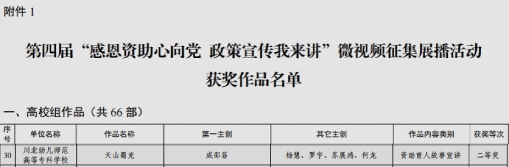 20、2025年11月学校选送的作品《天山蜀光》在四川省第四届“感恩资助心向党 政策宣传我来讲”微视频征集活动中获二等奖。