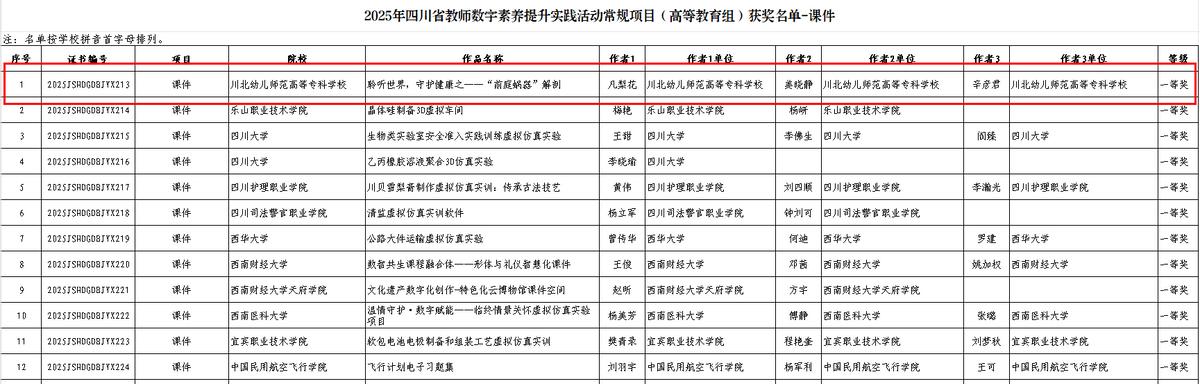 18、2025年11月学校课件与微课作品《聆听世界,守护健康——“前庭蜗器”解剖》在2025年四川省教师数字素养提升实践活动中荣获一等奖。
