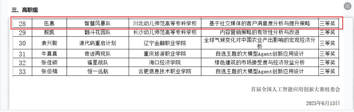 8、2025年6月学校获首届全国人工智能应用创新大赛三等奖。