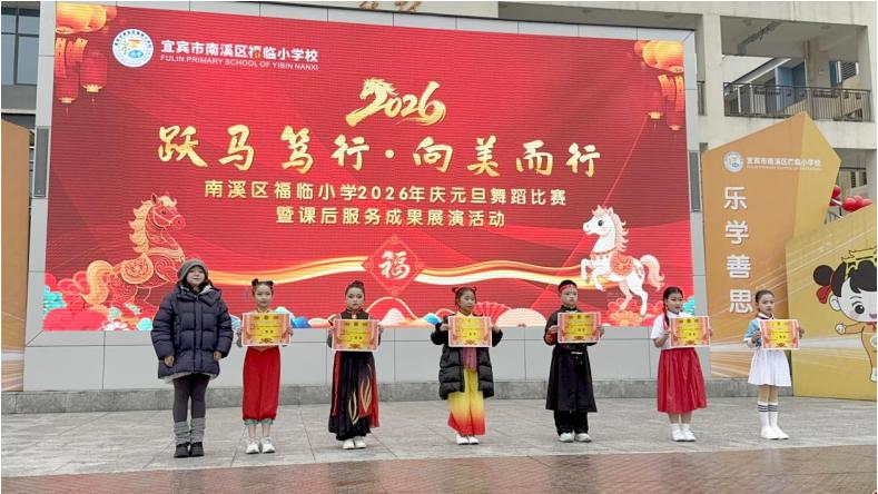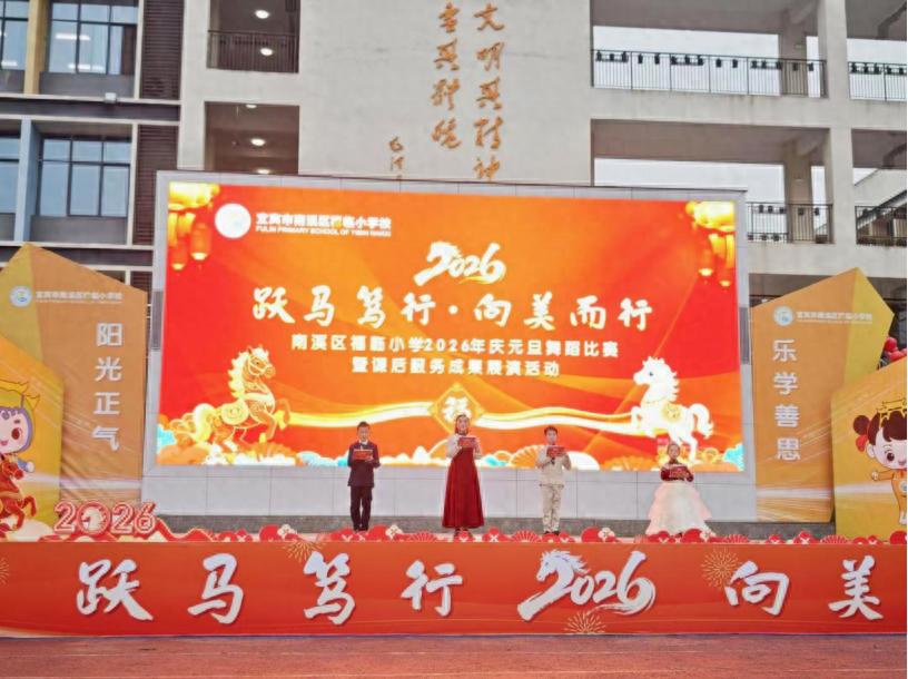 2025年12月31日上午,宜宾市南溪区福临小学校校园内洋溢着喜庆热烈的氛围,一场以“跃马笃行·向美而行”为主题的2026年庆元旦舞蹈比赛暨课后服务成果展演活动在此举行。